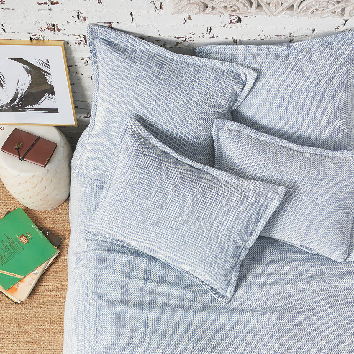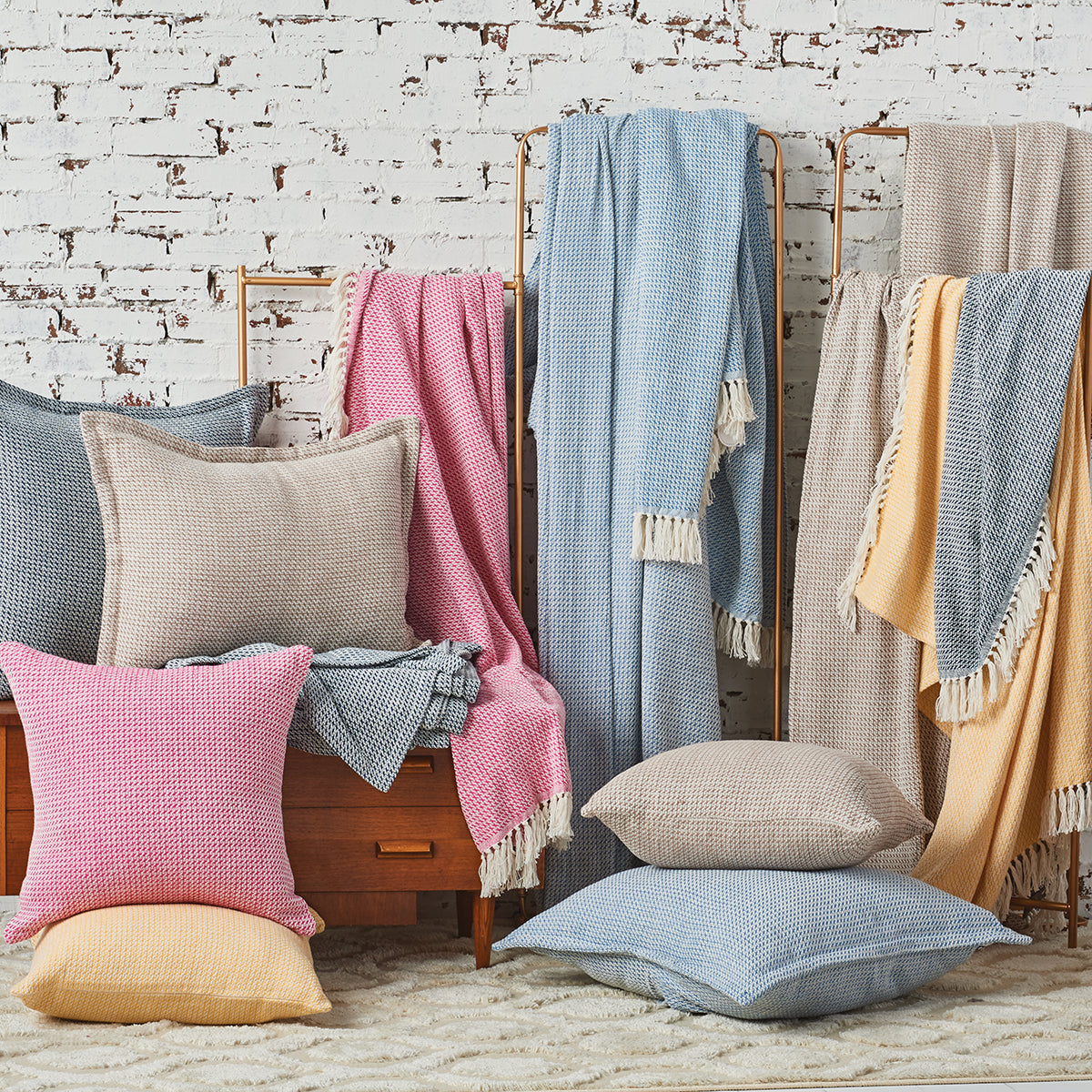 Classically glamourous and always in fashion, the Langford Collection of throws, blankets, pillows and shams from carol & frank will add eye-popping color and endless style to your decor. Hand loomed with a mini houndstooth pattern, and available in Indigo, Santorini and Dune colorways this collection is as versatile as it is stylish. With such a wide variety of colors and styles to choose from, do not forget to mix and match for a look that is both creative and chic. Natural slubs and variations attest to the hand loomed quality of this stylish collection making each piece uniquely yours. In a hurry? No worries as Langford is crafted of 100-percent cotton and is machine washable for easy care.