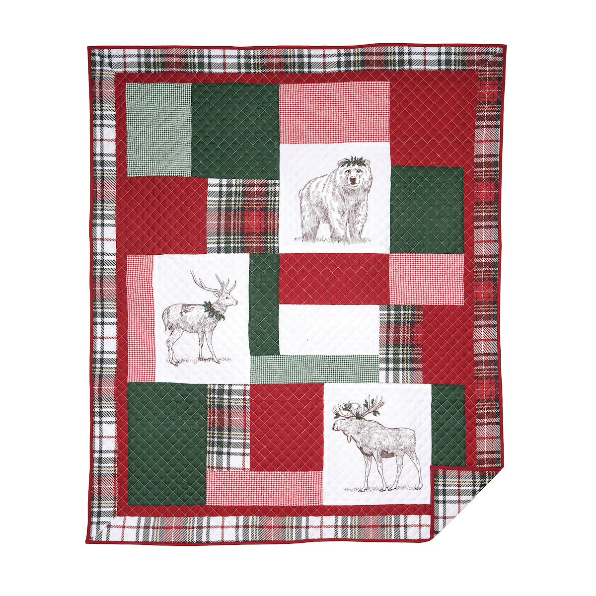 Decorate your home for the season of cozy slippers and toasty fires with the Lennox Holly Throw. This festive cotton throw features woodland bear, moose, and deer sketches appliqu?d onto a cheerful Christmas red and green ground. Reverses to classic plaid for more styling options. Pair with coordinating Lennox accents for a stunning winter holiday look. Crafted of cotton this throw is machine washable for easy care.