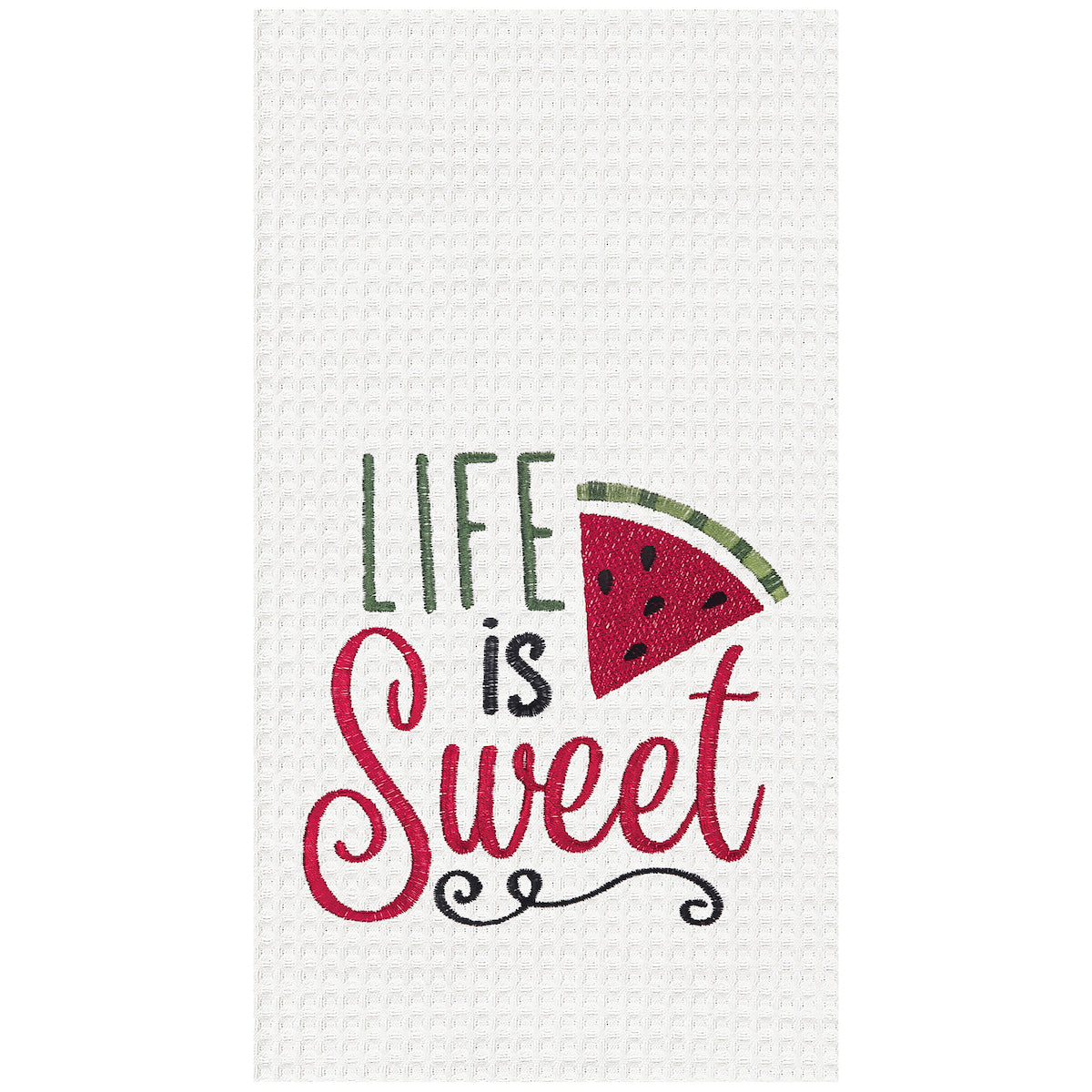Add a touch of summertime charm to your kitchen with our Life Is Sweet Embroidered Kitchen Towel. Crafted from absorbent waffle weave fabric, this delightful towel features the phrase Life Is Sweet in playful typography, accented by a vibrant red watermelon slice and elegantly underlined with a delicate flourish. The textured weave enhances drying power, making it as practical as it is stylish. A perfect addition to your seasonal decor or a thoughtful gift for anyone who loves the sweetness of summer!