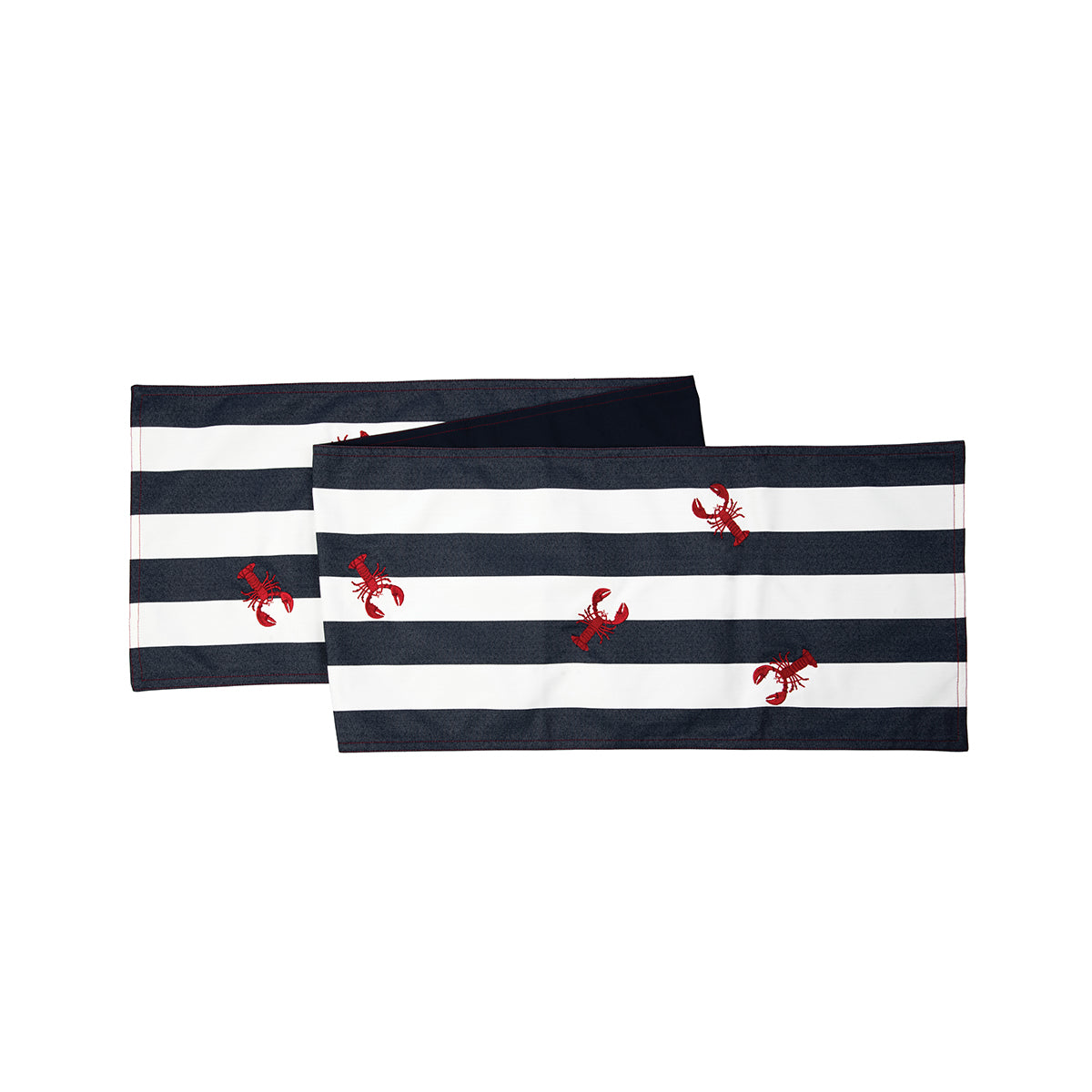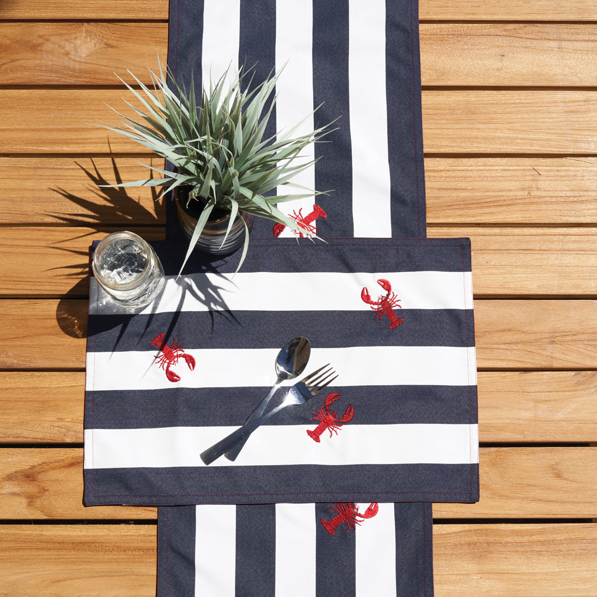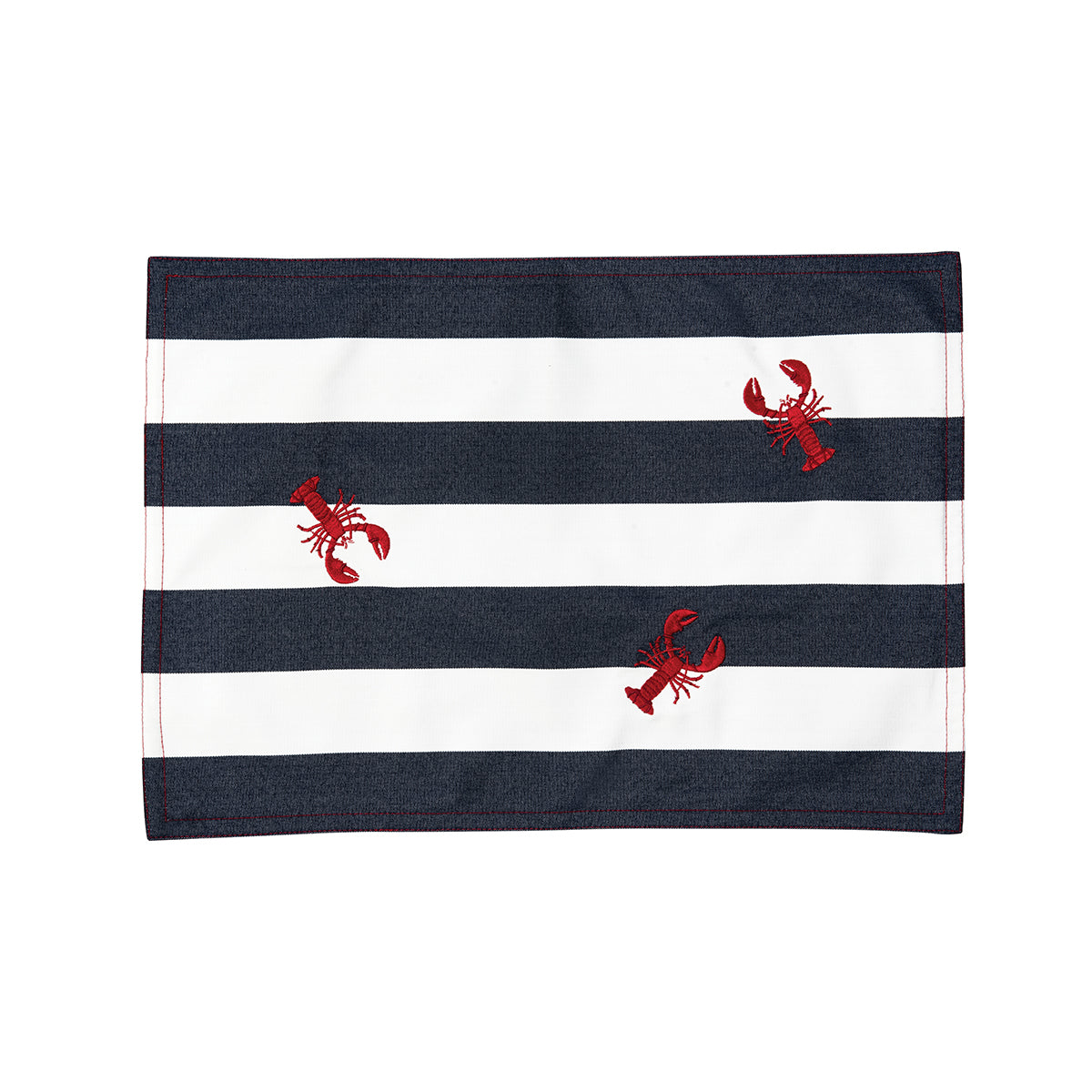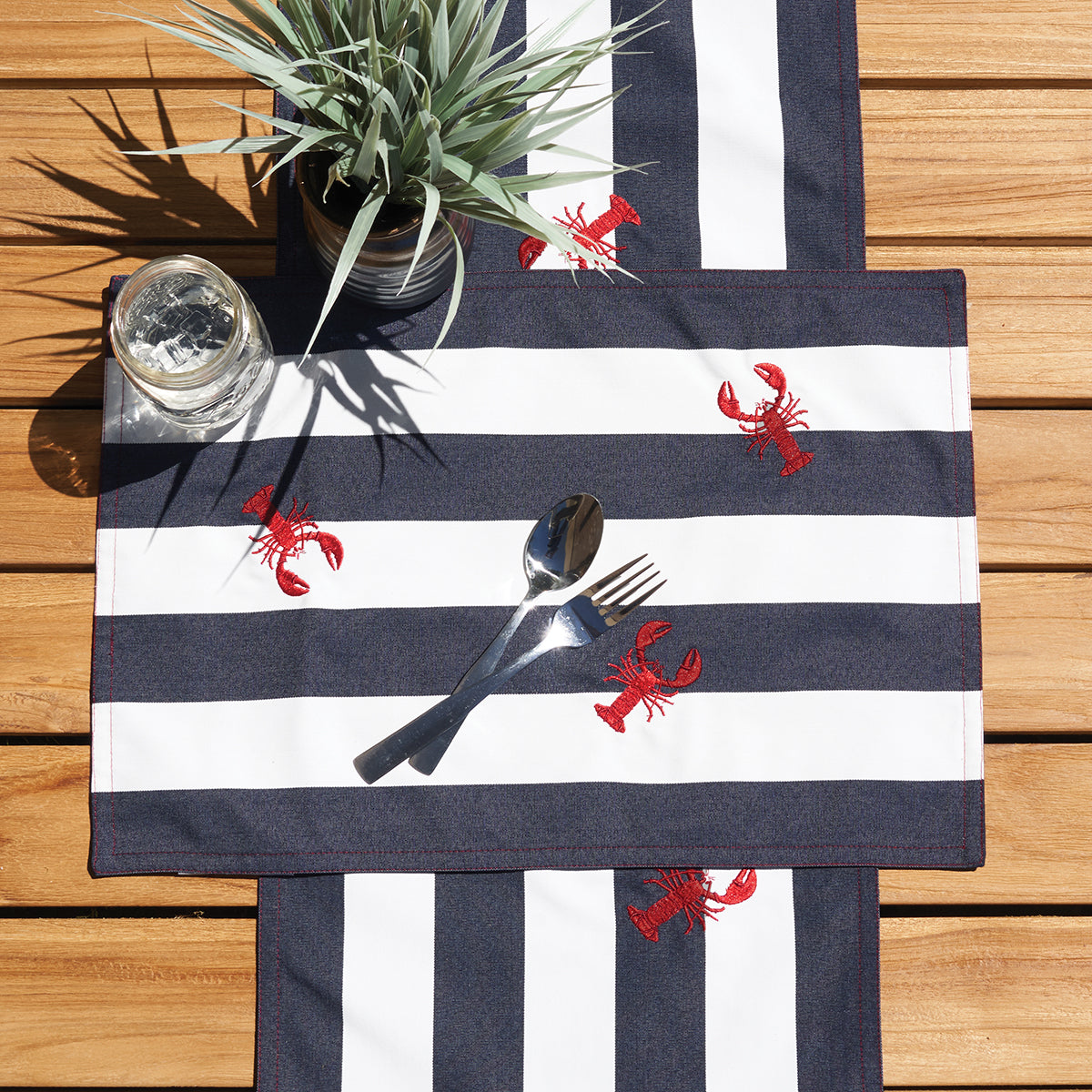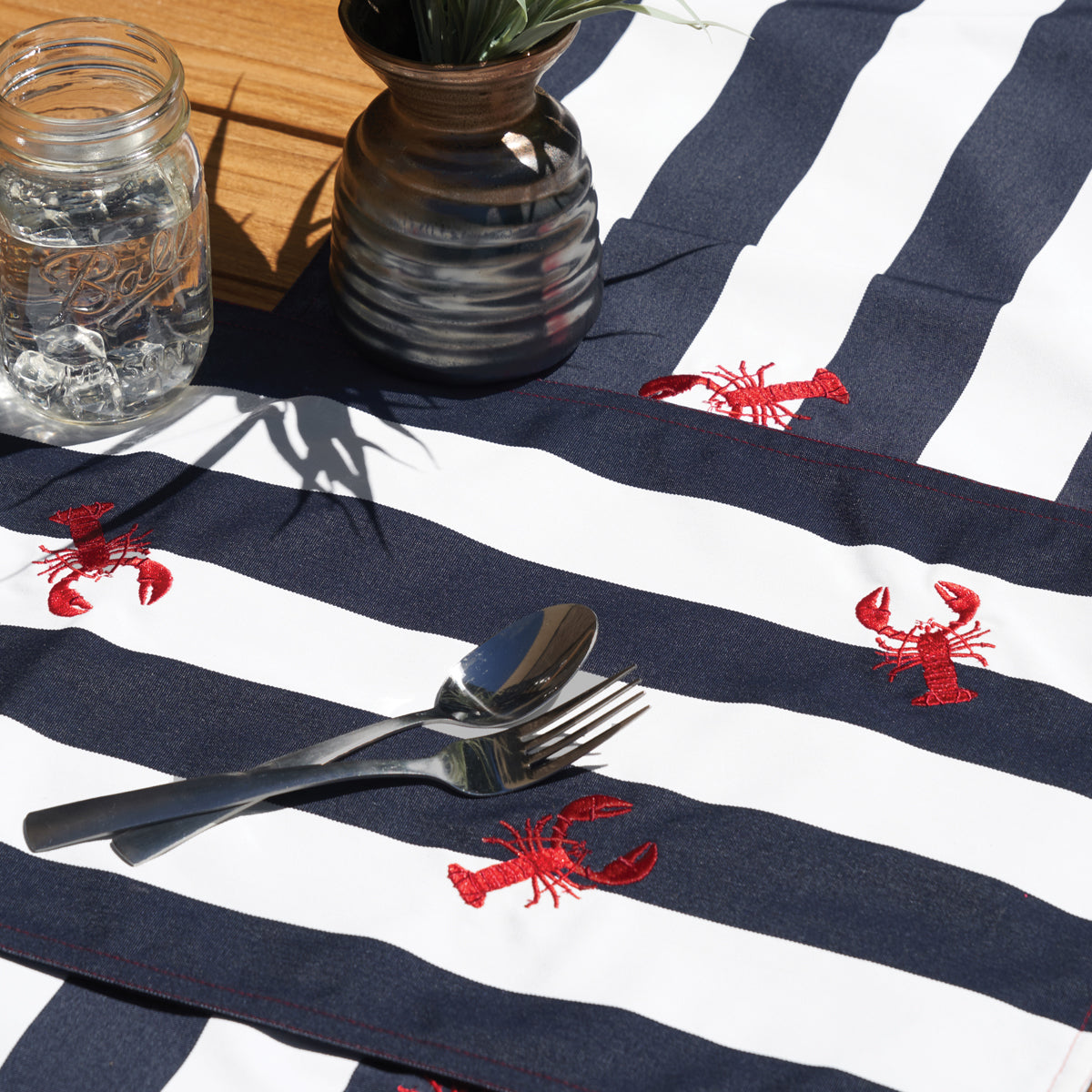 Rich navy and white stripes capture the essence of coastal charm for tabletops, enhanced by embroidered red lobsters that set the scene for an ideal beach house gathering.