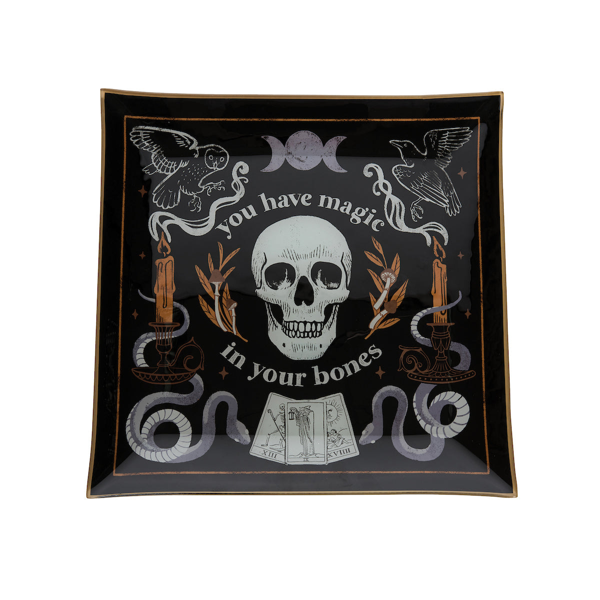 Infuse any space with a touch of mystical charm with this enchanting glass tray, featuring artwork from Janelle Penner, the words "You Have Magic in Your Bones" surrounds an intricately detailed skull. Adorned with captivating icons like tarot cards, snakes, owls, and candles, this tray is perfect for adding a hint of mystery to any decor. Whether used for serving or as a decorative accent, it makes a spellbinding statement. Ideal for showcasing trinkets, jewelry, or even snacks, this tray combines function and whimsy, making it a magical addition to any room or gathering.