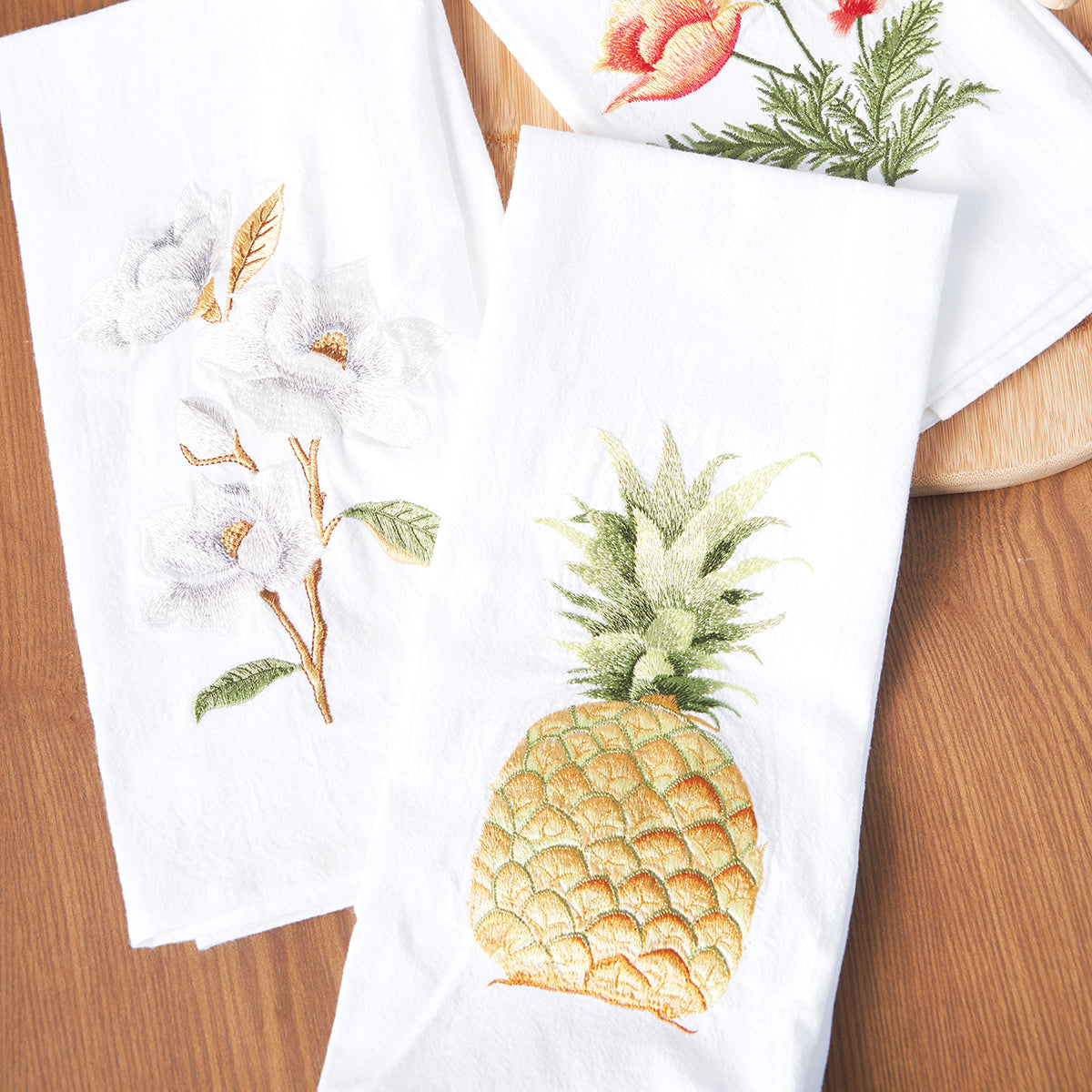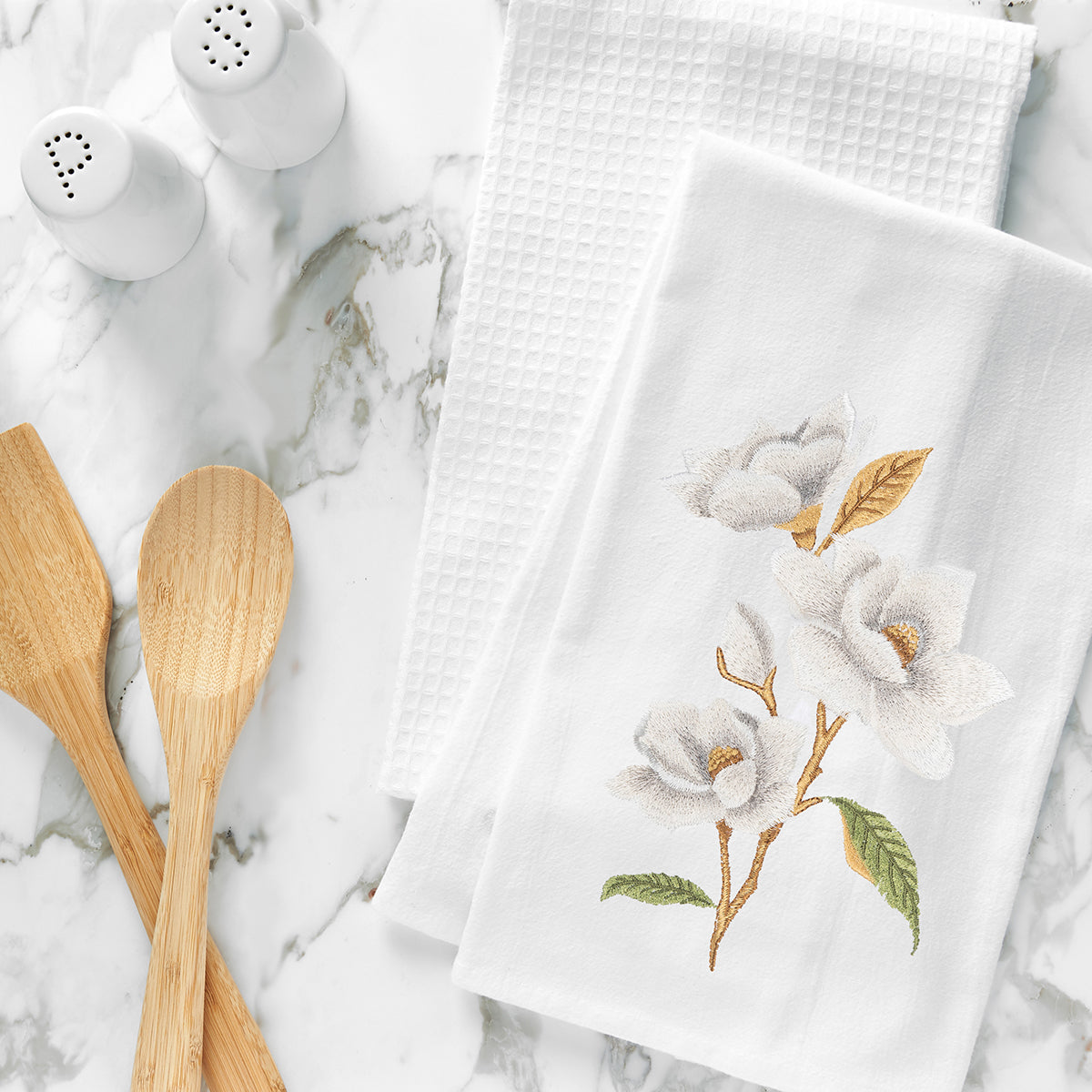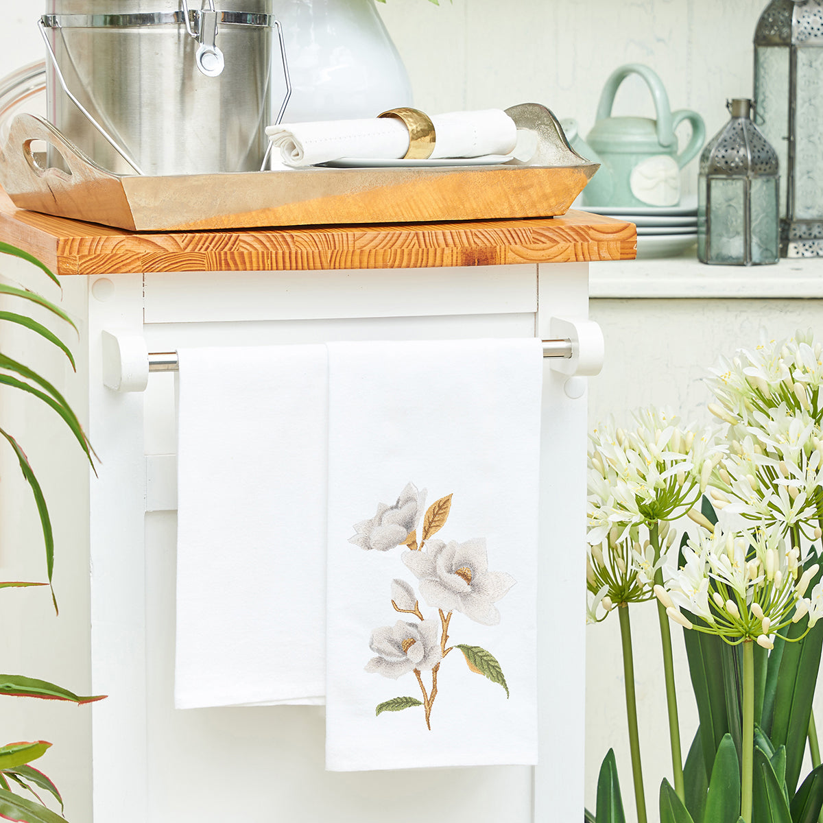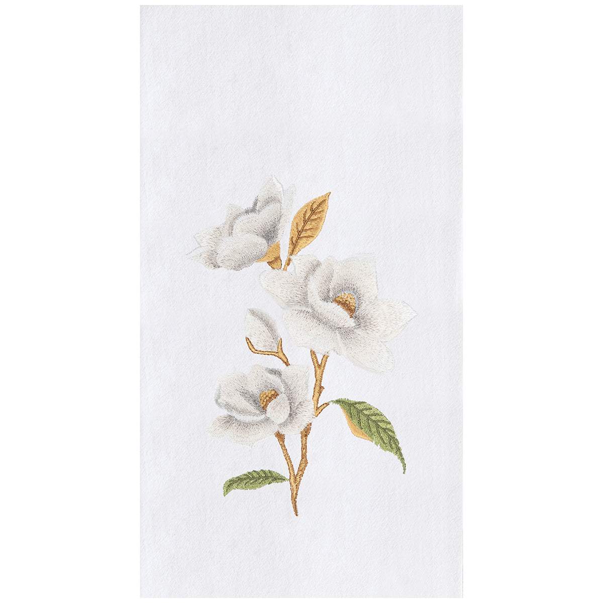 Exquisite as a kitchen accent or a thoughtful gift, this flour sack towel showcases realistic magnolia flowers in delightful neutral shades.