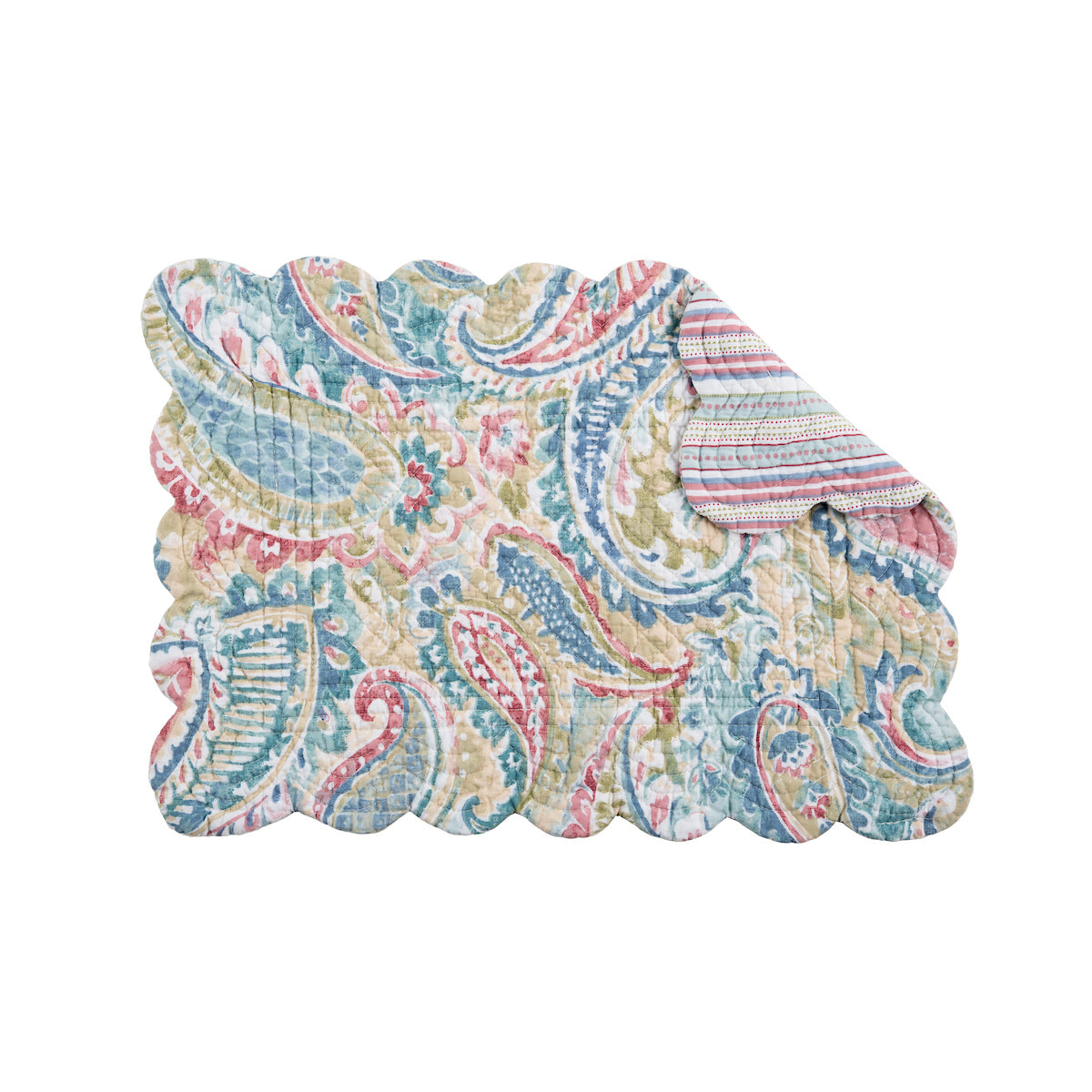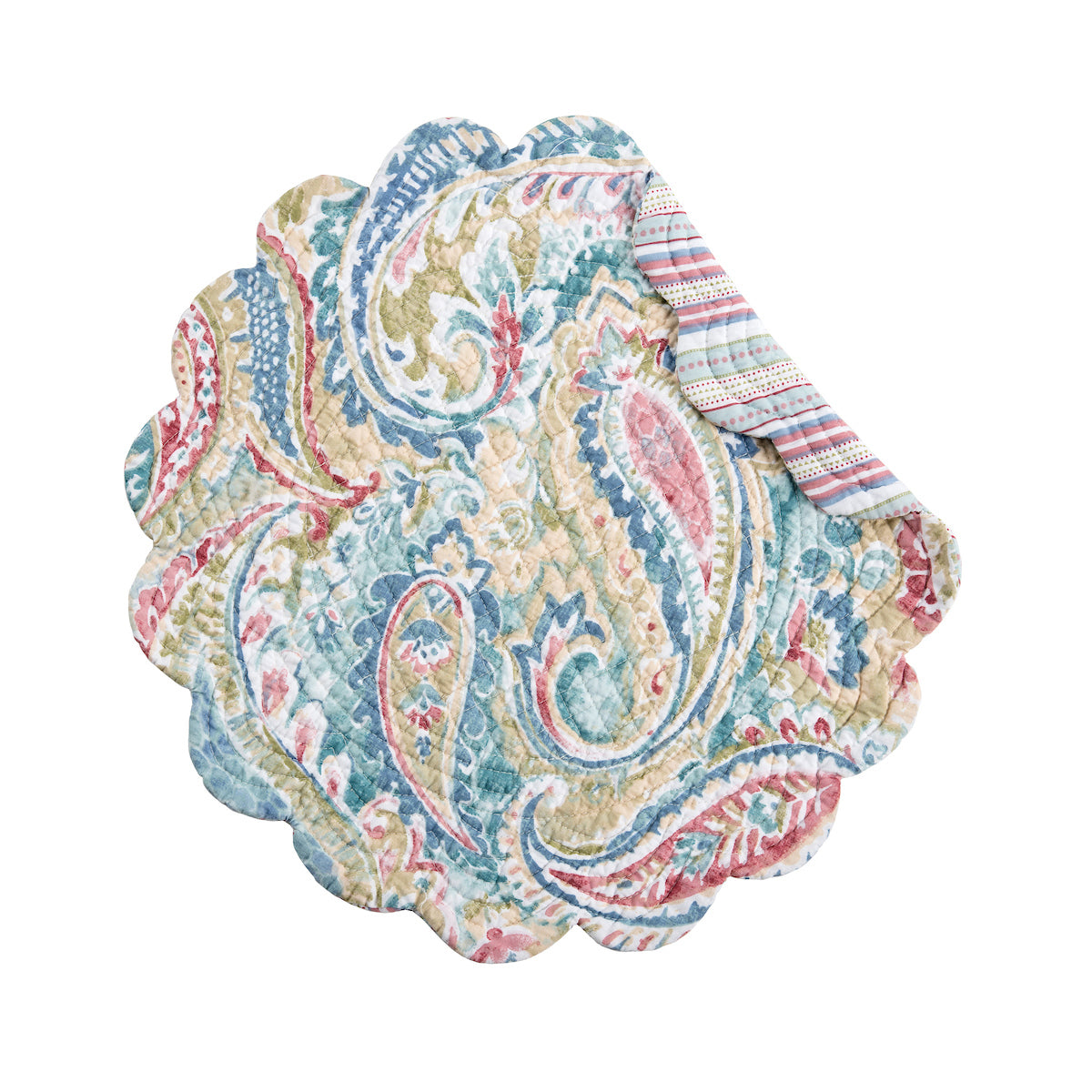 Displaying a large-scale paisley pattern in blues and mauve paisley motifs, the Maisie tabletop collection will freshen up your dining table with a splash of color. Reversible to a coordinating striped pattern for additional styling options.