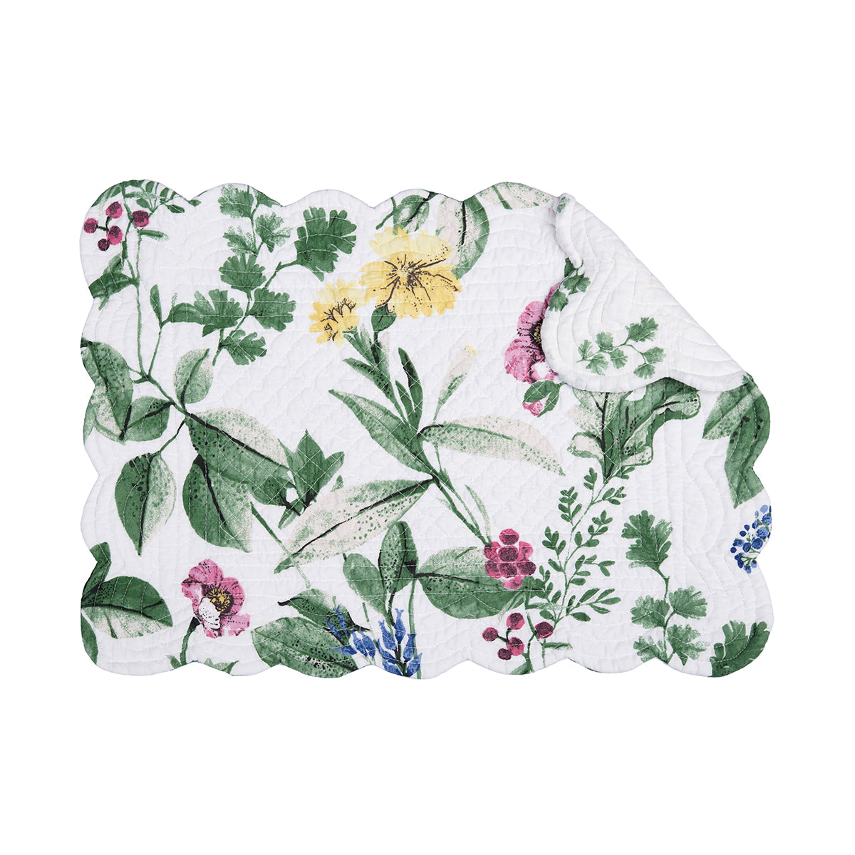 Perfect for year-round use, the Marcy Blooms quilted table linen collection showcases lush green foliage with delicately painted flower petals peeking through the dense leaves. Pops of yellow, pink, and purple are beautifully complemented by watercolor-splattered leaves. For a simpler look, reverse to a clean, white background with a subtle leaf pattern. Love this look? Marcy Blooms is also available as a bedding collection.
