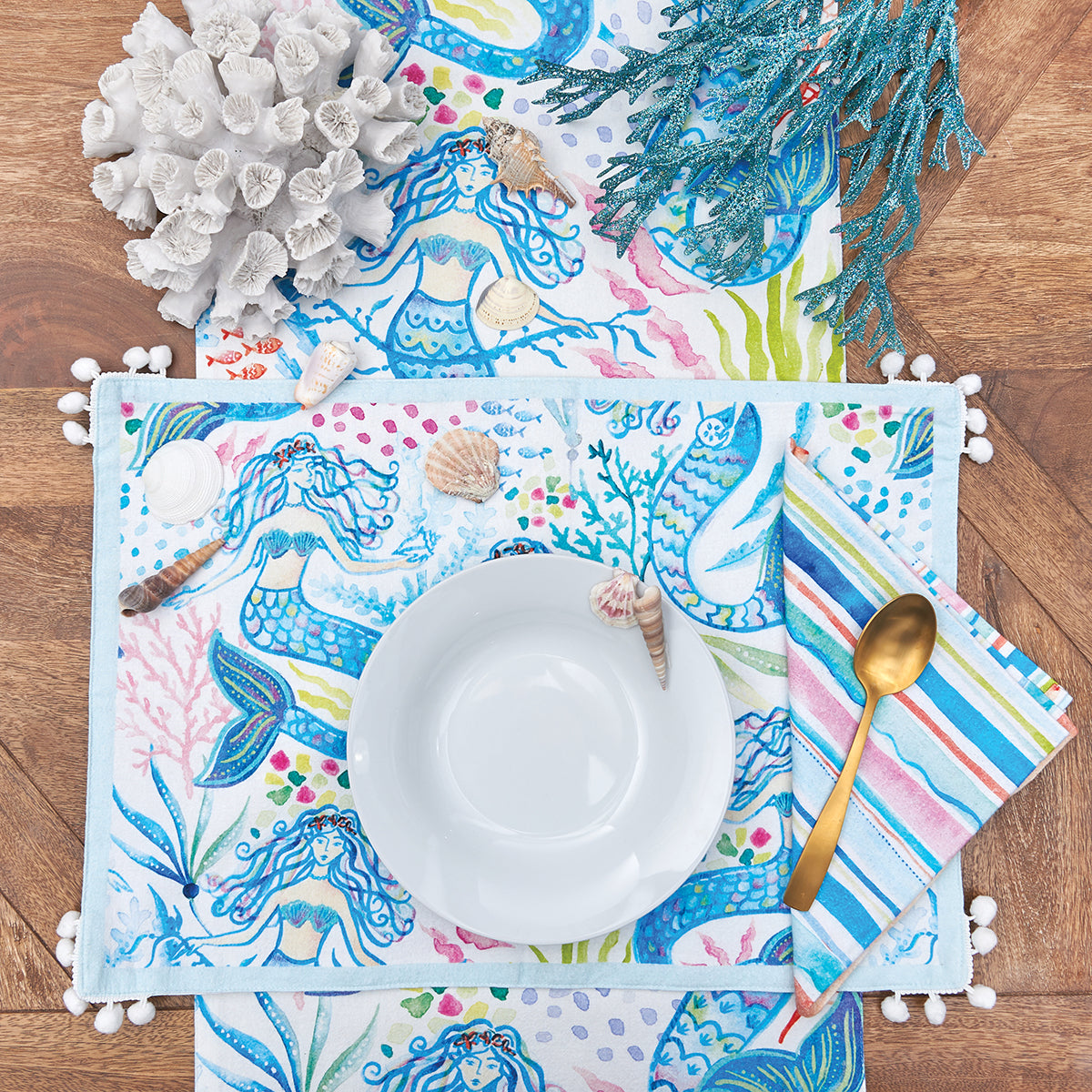 The Mermaid Garden collection of table linens brings magic to your kitchen or dining room. This cotton placemat features a whimsical watercolor mermaid design by LoriLynn Simms and a youthful pom pom fringe that makes your summer pool parties and coastal events more fun than ever.