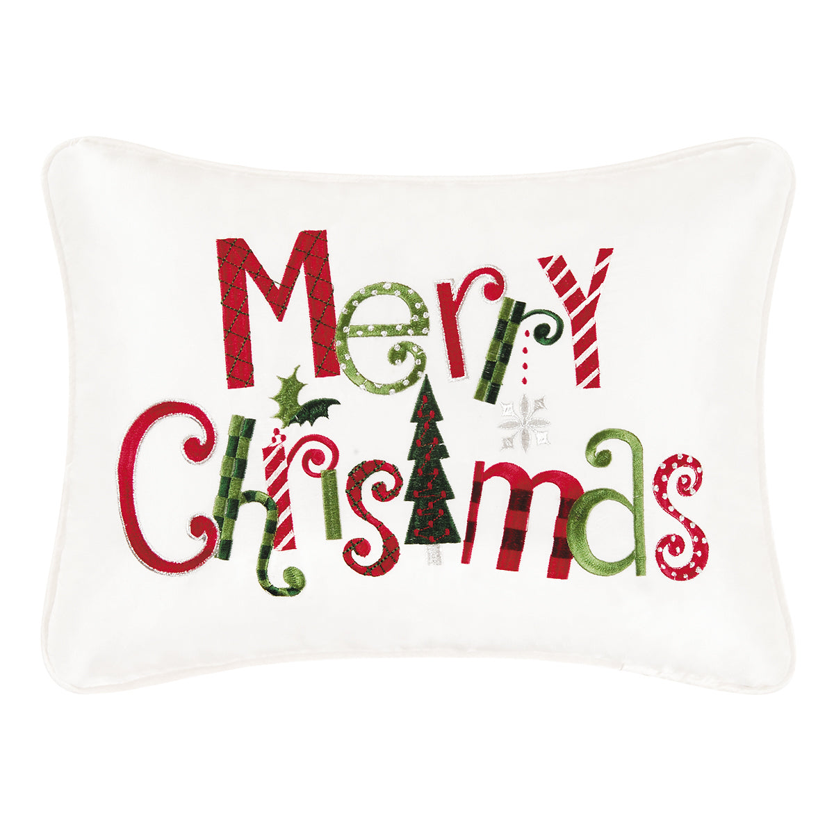 Set a whimsical holiday scene in your home with this jovial accent pillow. This fun pillow displays the message Merry Christmas embroidered in a festive red and green on a crisp white ground. Finished with a coordinating white piped edge, this pillow is sure to bring a bit of holiday delight to your decor. Crafted with a nylon/polyester blend cover, this pillow has a removable polyester insert and is secured with a zipper closure. Size: 12 x 16 inches. Spot cleaning recommended.