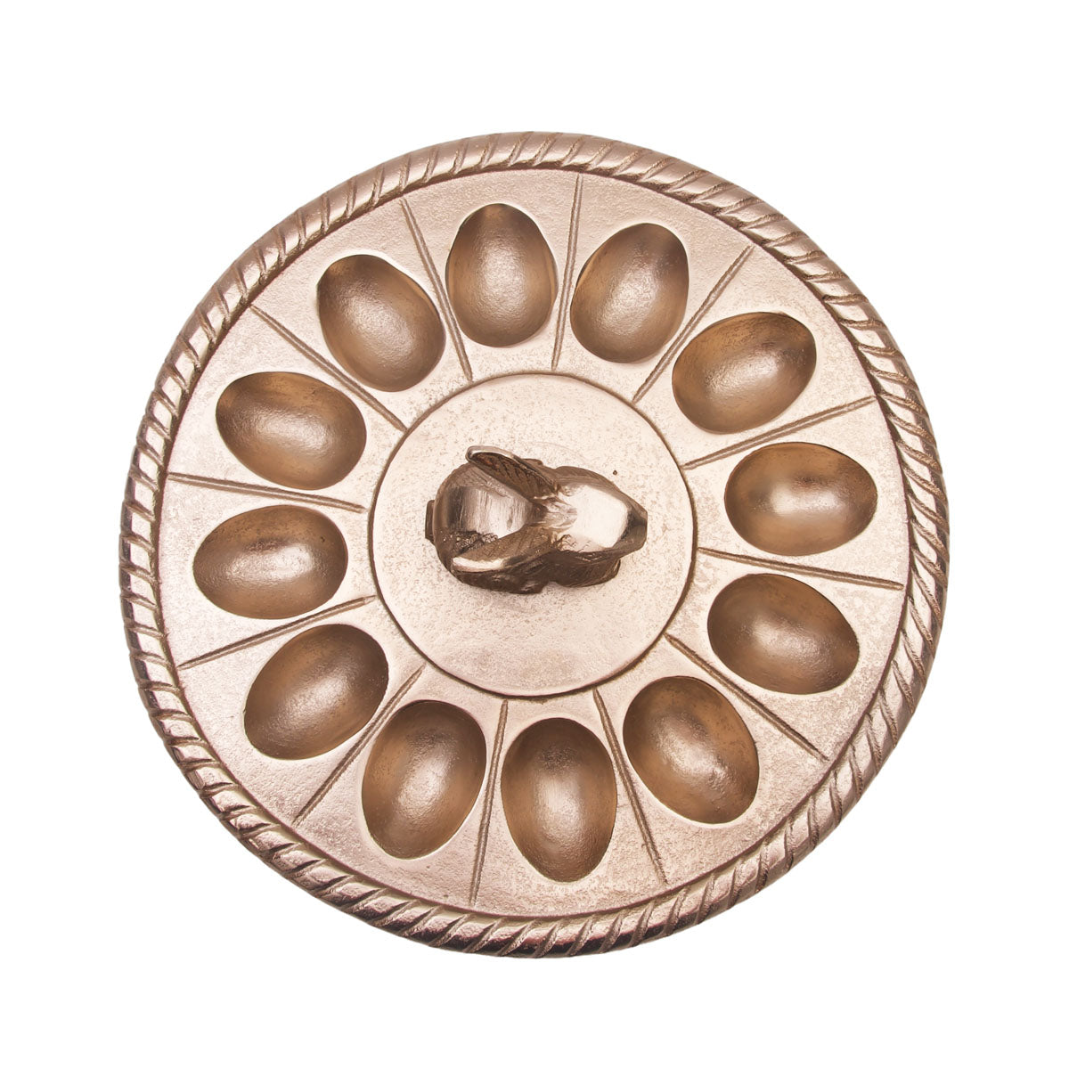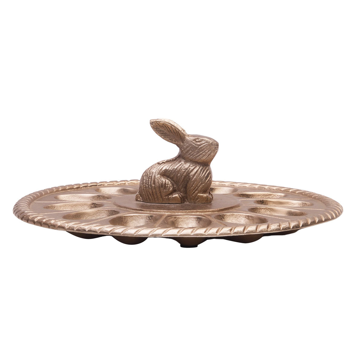 Celebrate the season with the Metal Bunny Egg Plate, a decorative piece that combines elegance with playful charm. Crafted in a light bronze metal finish, this plate features a cute bunny sitting at the center of a circular design with egg-shaped sections, making it a perfect addition to spring or Easter decor. Display decorative eggs or seasonal accents in style with this unique plate, which adds a touch of whimsy and sophistication to any space.
