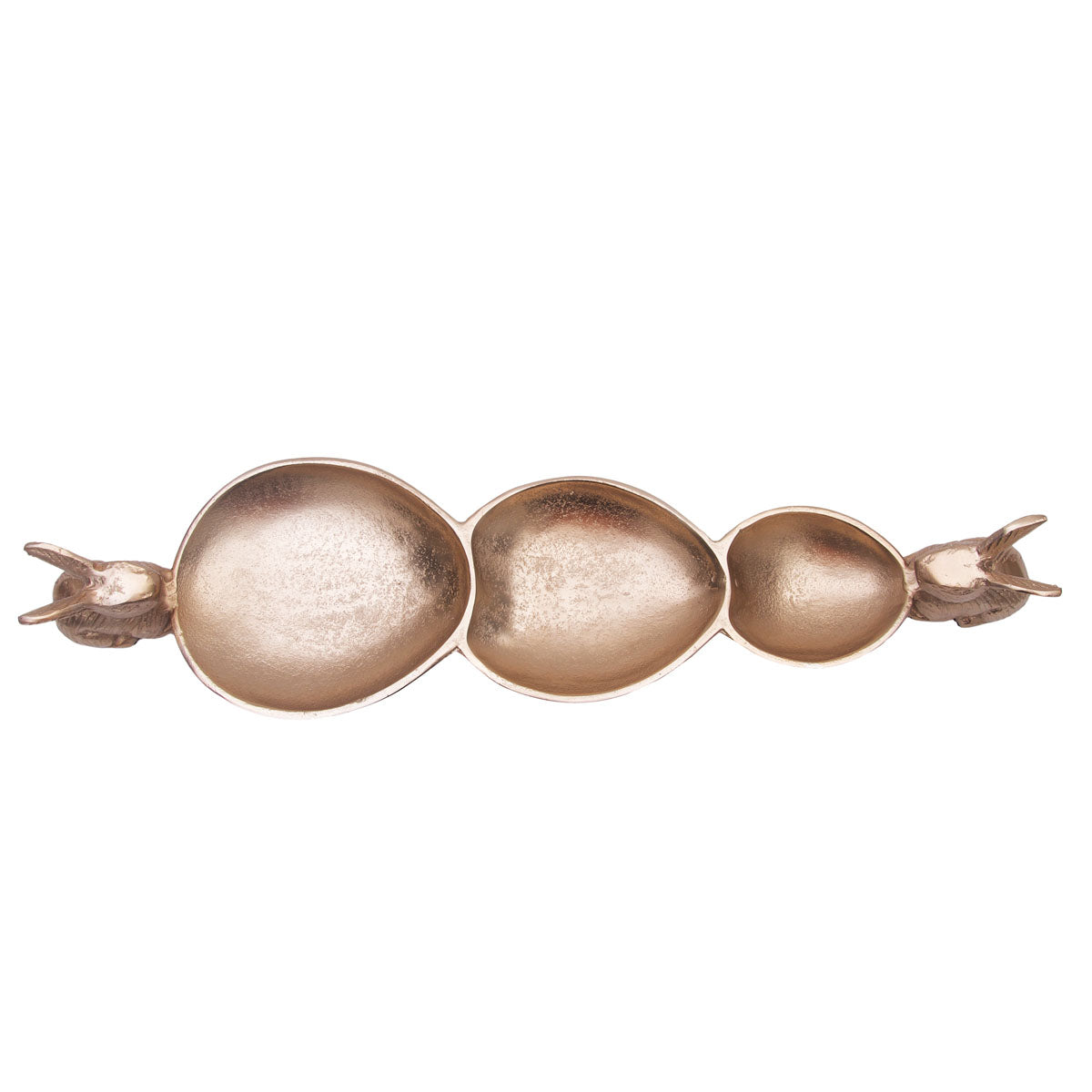 Add a touch of whimsy to spring decor with the Metal Sectional Bunny Plate. This unique, light bronzed decorative piece features two sitting bunnies on either side, with three eggs connecting them in the center, creating a charming and playful design. Perfect for Easter celebrations or as an elegant decorative accent, the metallic sheen adds a sophisticated touch to any tabletop or display. This delightful bunny plate serves as a beautiful statement piece that brings seasonal cheer and style to any space.