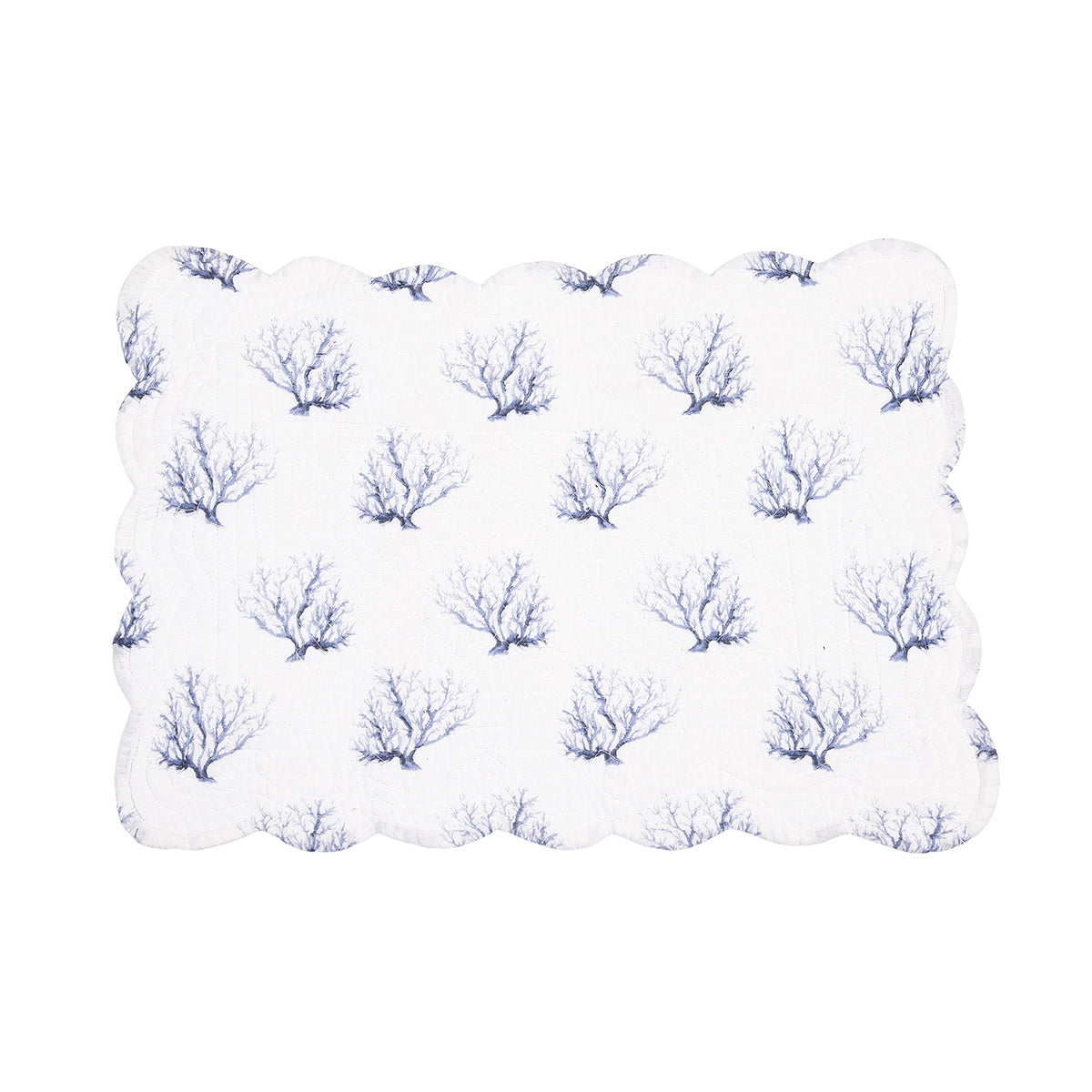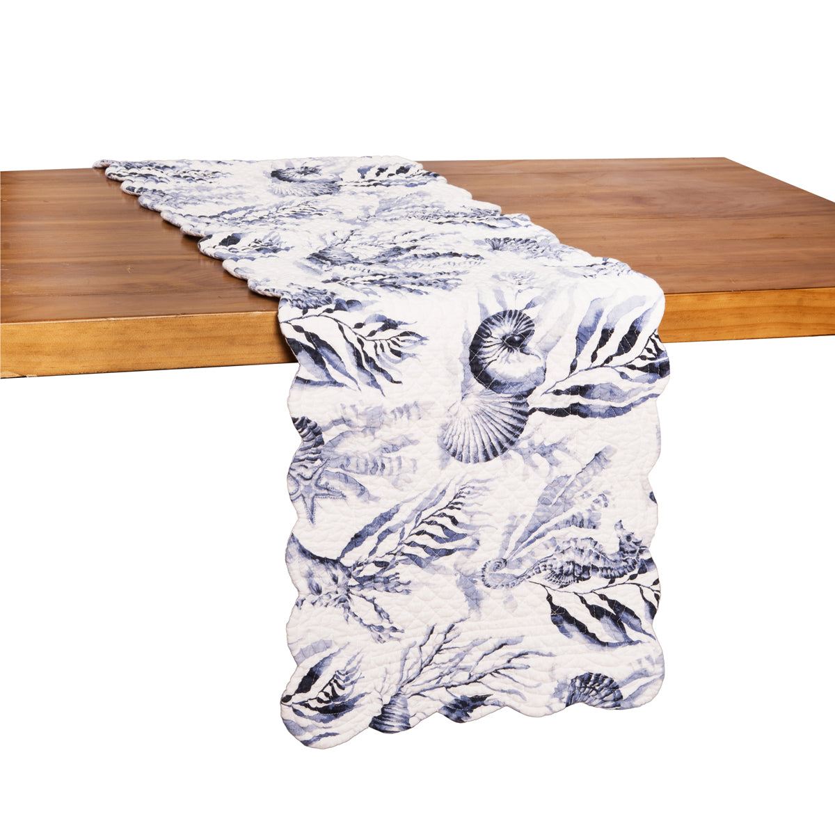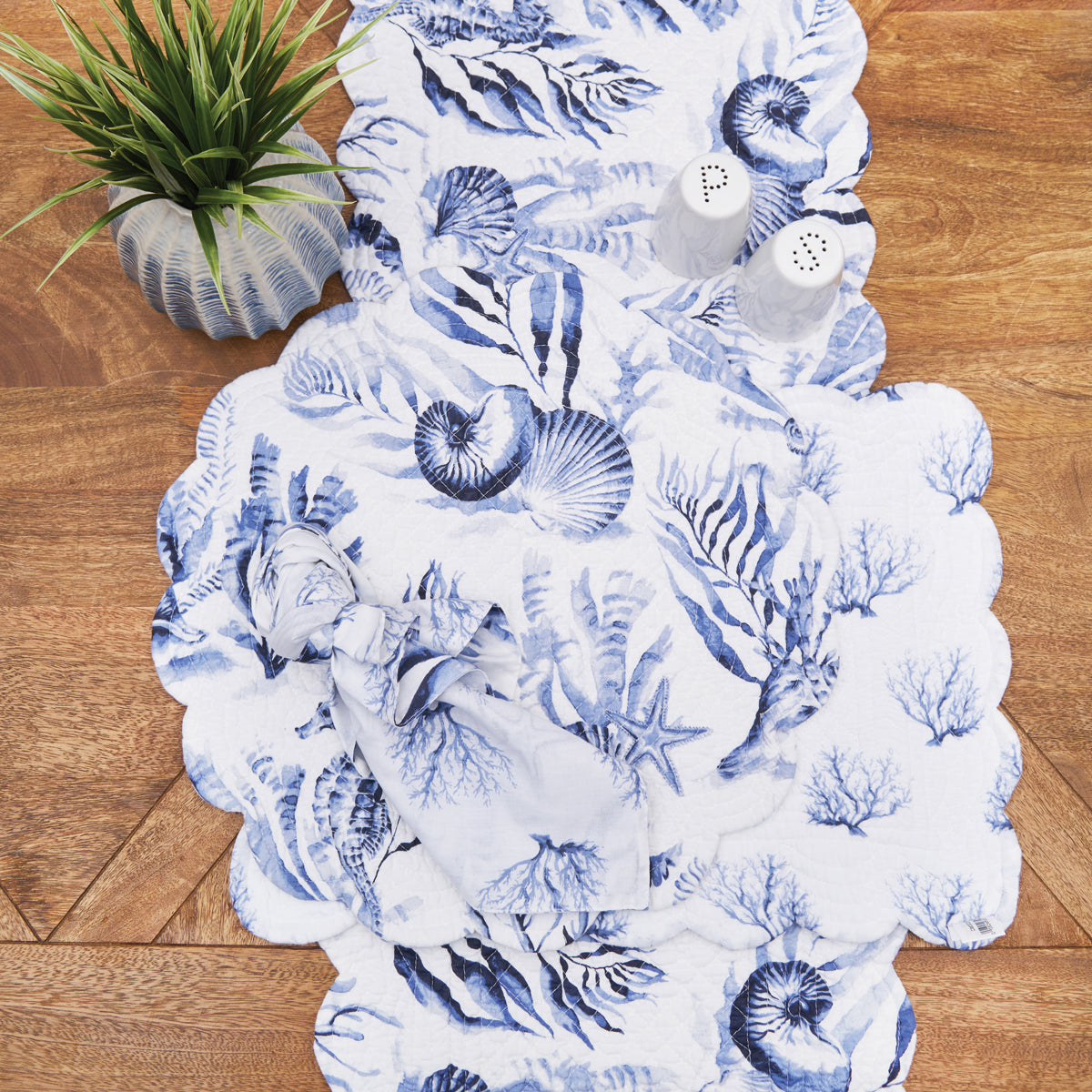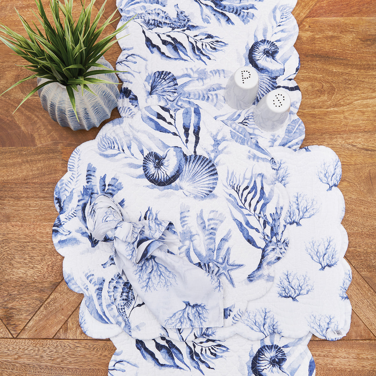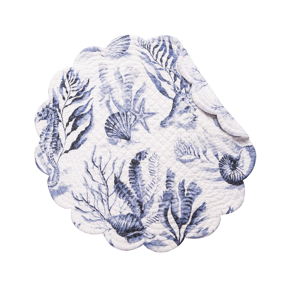 Create a coastal retreat with the charming Midnight Lagoon quilted table linen collection and matching reversible napkin. Crafted from a soft and durable cotton blend, these table linens feature a delightful underwater scene in soothing blue and white tones. The watercolor inspired coastal-inspired motifs including coral and shells for a touch of seaside charm in any space. For added versatility, the table linens reverse to a coral print on a white background, for more styling options. Love this look? Midnight Lagoon is also available as a bedding collection.
