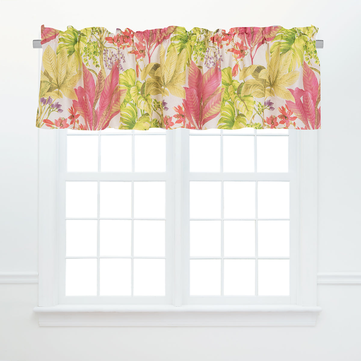 Create your own tropical paradise with the Moana ruffled valance. A botanical canopy of vibrant pink and green leaves with purple berry accents brightens any room in your home. Whether your style is a sunny summer look, a Caribbean getaway or Mediterranean vacation, Moana will bring it to life. This ruffled unlined valance is light filtering with a 2-inch rod pocket and a 1-inch decorative header. Crafted of cotton, machine wash and tumble dry low for easy care. Love this pattern? Moana is also available in a quilt set and tabletop collections. Each valance is 72 wide, hanging rod not included.