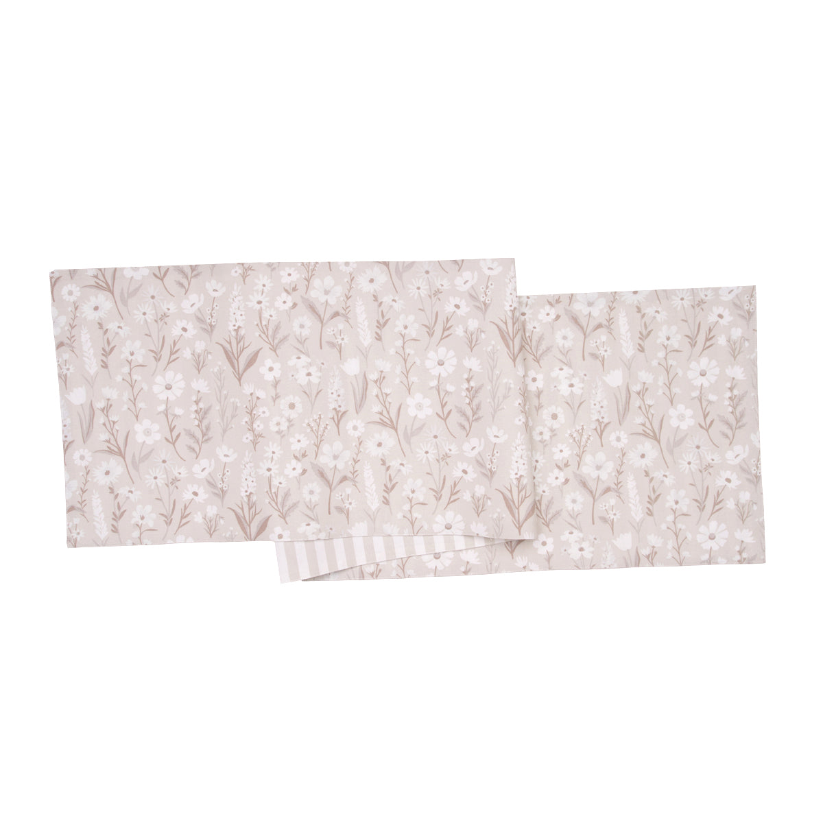 The Natural Botanical printed table linens bring understated elegance to dining spaces with their soft, nature-inspired design. Set against a soothing beige-grey background, the fabric is adorned with delicate white florals, creating a serene and inviting ambiance. The subtle yet sophisticated botanical pattern is perfect for those who appreciate a refined touch of nature in their decor. For added versatility, simply reverse to the coordinating striped design, offering multiple styling options to suit any occasion.