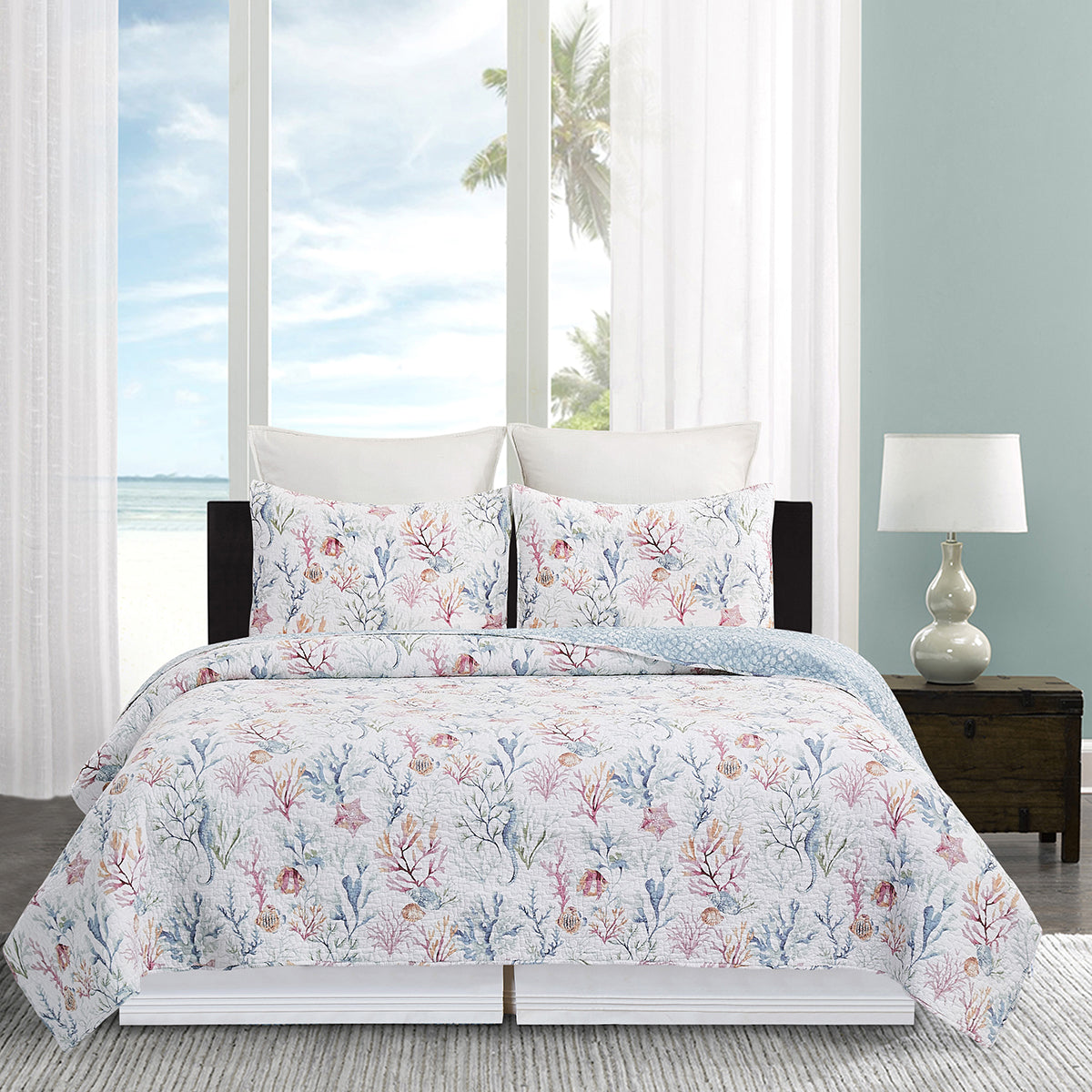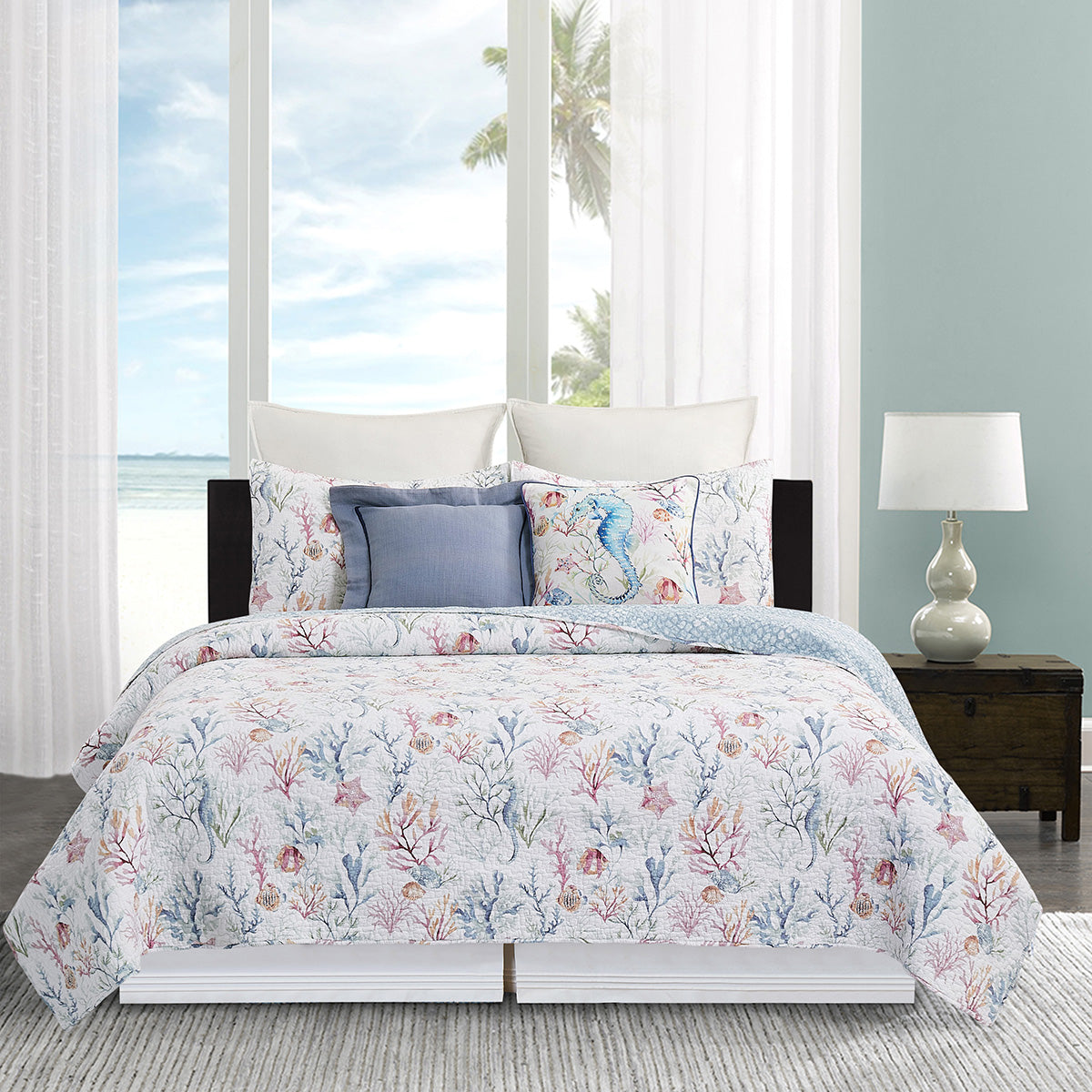 Create a serene coastal retreat with the enchanting Nori Coral quilt set, complete with two standard shams. Featuring a harmonious blend of blue, green, and pink hues, this set boasts a watercolor-inspired print depicting fish and seahorses gracefully navigating among ocean corals, adding a touch of aquatic beauty to any space. The random stitching pattern adds a subtle textural element, enhancing the overall charm. For versatility, the reverse side showcases an ombre blue design reminiscent of an underwater mirage, with intersecting lines creating a mesmerizing ripple effect, evoking the tranquility of the ocean depths. Love this look? Nori Coral is also available as a table linen collection.