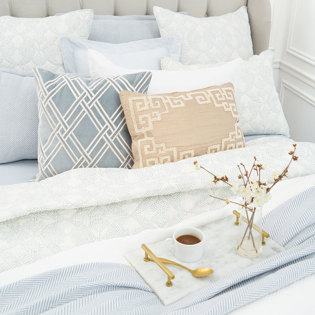 The subtle hand-printed design of Paloma is inspired by an exquisite floral tile that displays all the allure and romance of an ancient Indian temple. This abstract floral design is screen printed by hand on 100% cotton gauze, with subtle quilting that follows the flowing curves of this pattern. The Paloma Euro Sham keeps your bed light and airy with a wistful fog and white colorway, and has been known to inspire sweet dreams and utter relaxation.