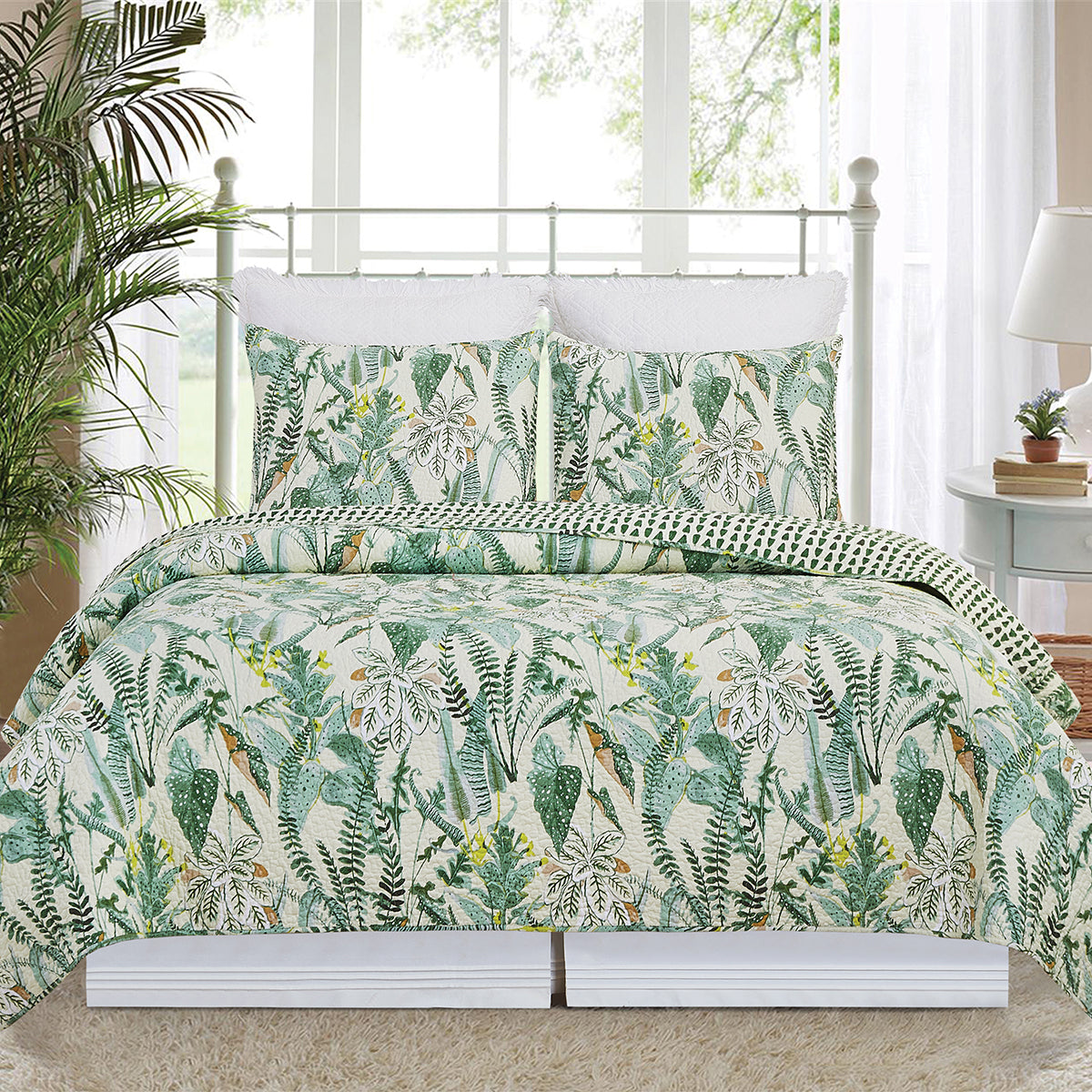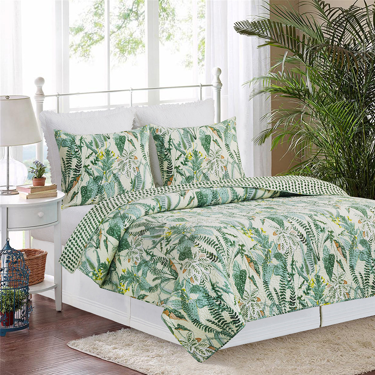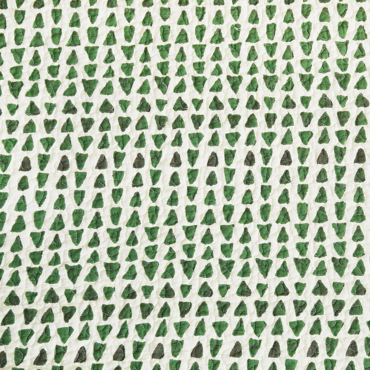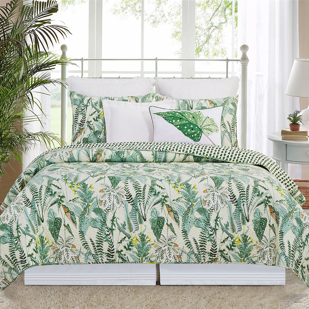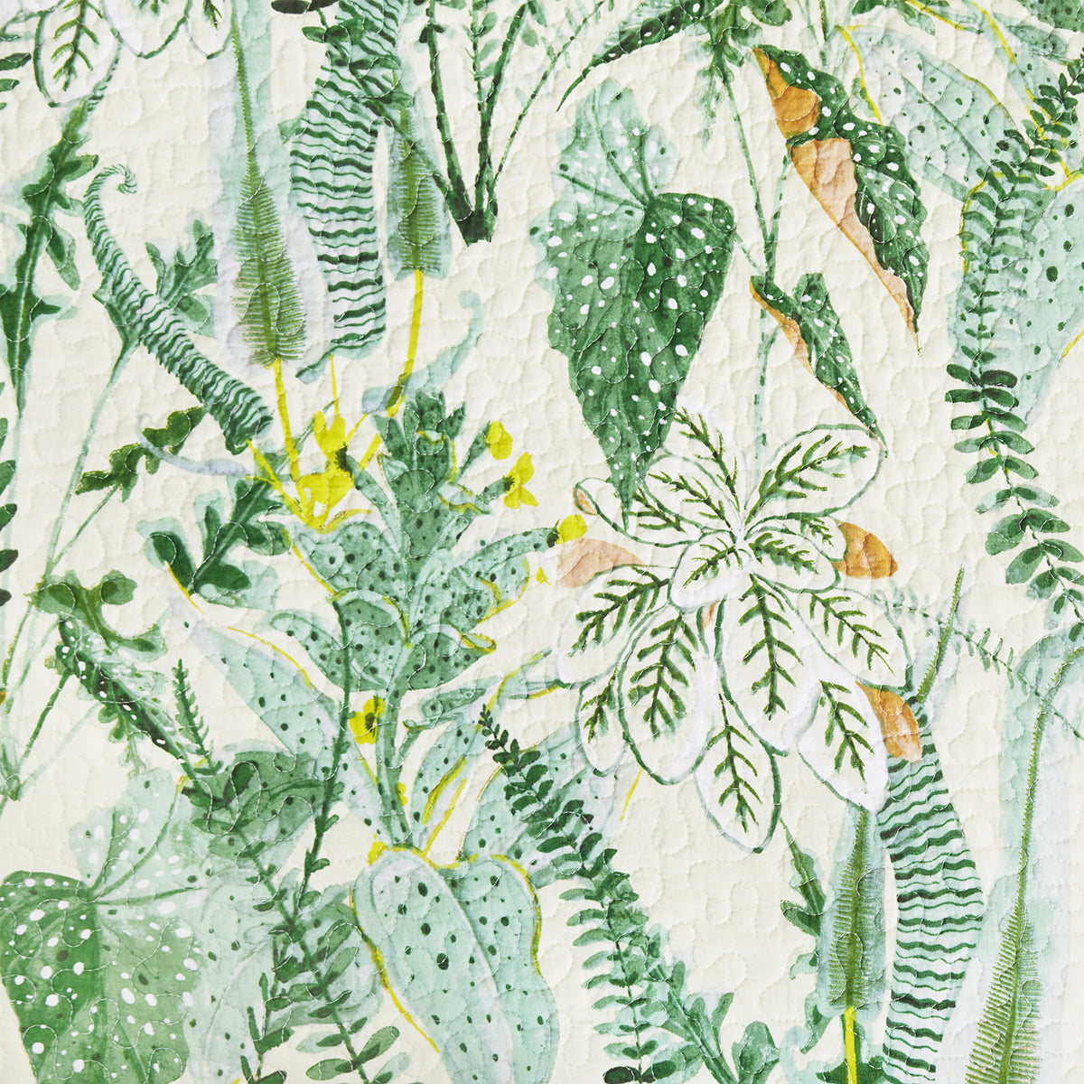 Transform any space to a tropical oasis with the Parson quilt set, complete with two standard shams. The pattern features lush tropical leaves in vibrant shades of green, yellow, and white in a mesmerizing watercolor style. Each leaf is artistically interpreted with intricate details and tiny dots. Crafted with a random stitching pattern, this quilt reverses to a striking stripe pattern created from abstract green watercolor triangles for a contemporary twist on this classic design. Love this look? Parson is also available as a quilted table linen collection.
