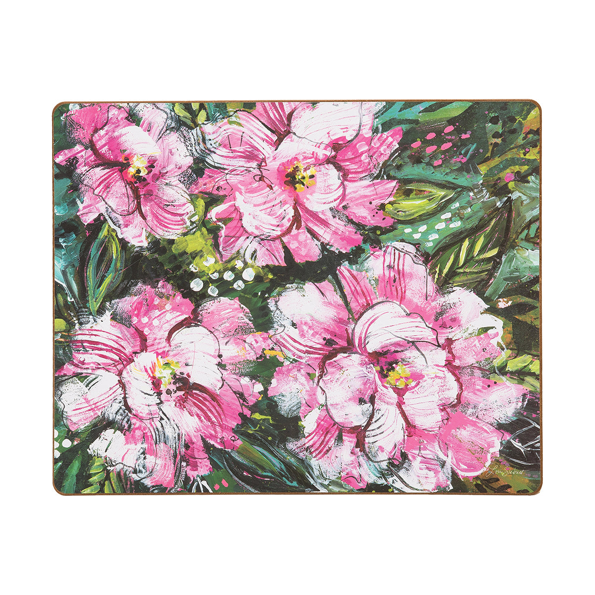 Peonies are a symbol of romance and good fortune that steal the show with their classic beauty. The Peony Hardboard Placemat features mixed media artwork by Lori Siebert. Our hardboard placemats are constructed to provide an enduring surface to protect your table from heat, scratches and staining. Designed for your everyday living these hardboard placemats are heat resistant up to 212°F, constructed with a cork backing, hardwood middle and decorative printed design. These hardboard placemats are not suitable to be used as a cutting surface, and should be protected from sharp objects. Care is simple and easy, with a damp sponge or cloth. Do not submerge in water.