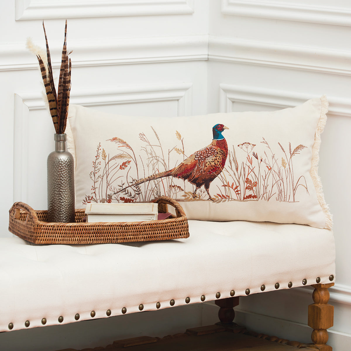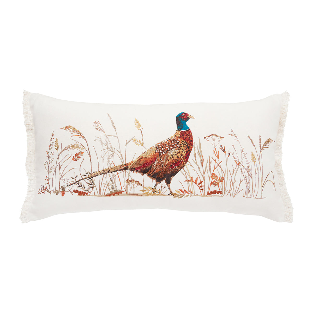 Featuring a stunningly embroidered pheasant design, this Pheasant Landing Indoor Lumbar Pillow brings a touch of rustic elegance to any setting. Perfect for indoor use, it effortlessly blends comfort with style, making it an ideal accent piece for a living room, bedroom, or study. Whether placed on a cozy chair or as part of a welcoming entryway display, this pillow adds a charming and sophisticated flair to any space.