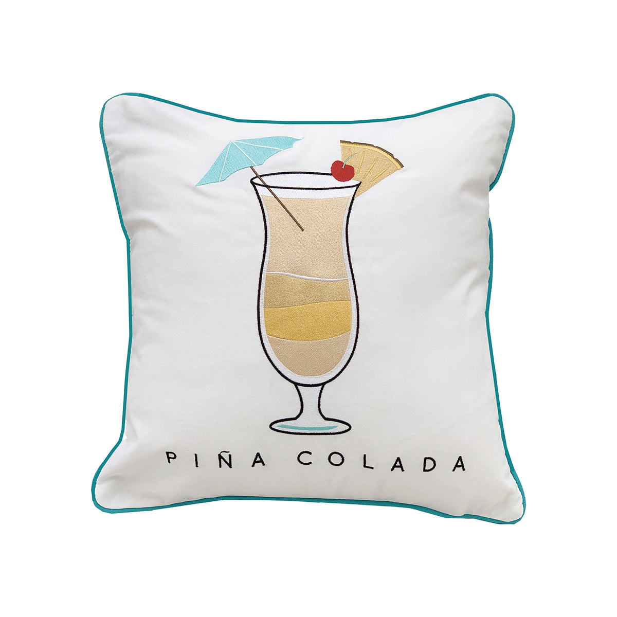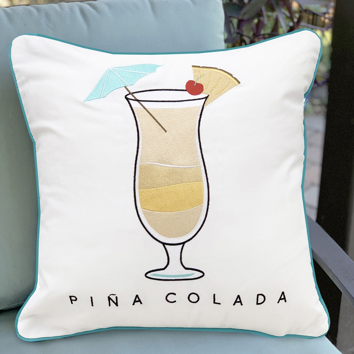 Add a splash of fun with our pina colada cocktail pillow! Featuring heavily embroidered multi-colored threads, this sun fade resistant pillow is made outdoor tough and is the perfect accent for that outdoor bar or gathering space.