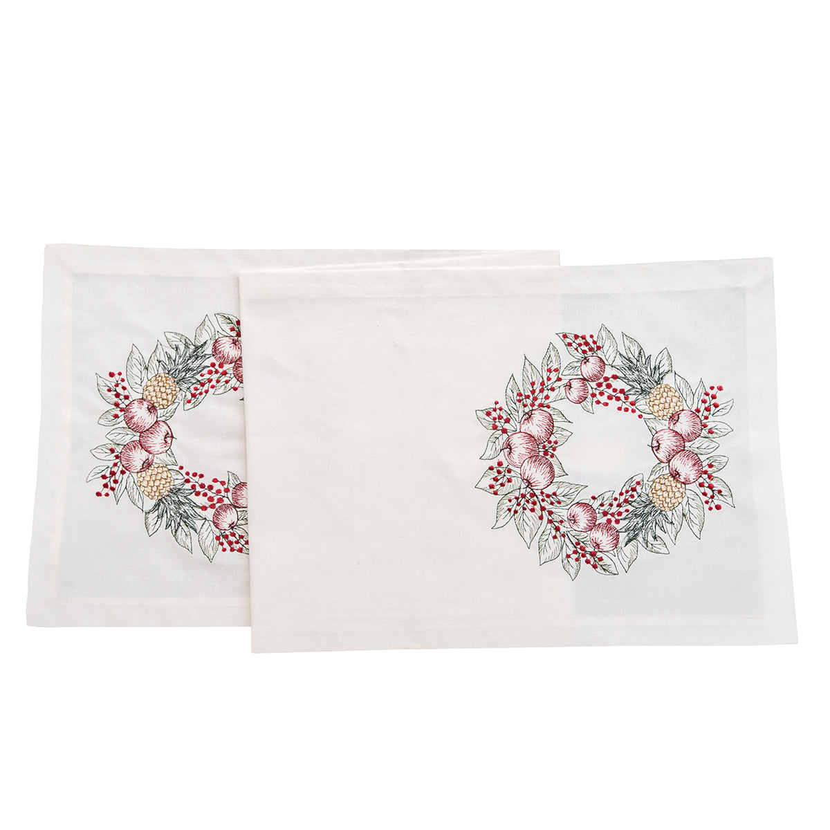 The Holidays meet tradition with our WILLIAMSBURG embroidered Pineapple wreath table linens. Add a dash of southern charm to your holiday decor with the beautifully embroidered holiday wreath on both ends of this table runner. Greenery, red berries and pineapples on a white ground are an elegant addition to your tablescape. Crafted of 100-percent cotton and finished with a hemmed edge. Spills or stains? No problems, this table runner is machine washable for easy care.