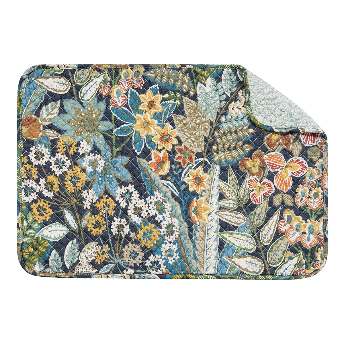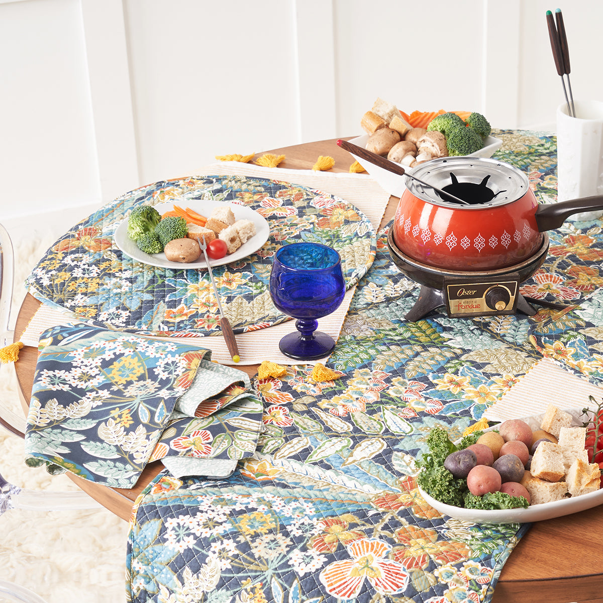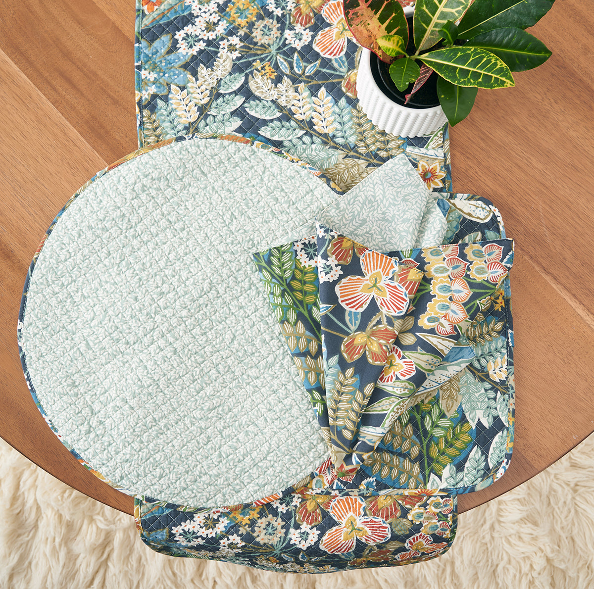 Posy table linens feature a charming array of artistically depicted flowers set against a rich indigo backdrop, evoking a picturesque meadow. Radiant dandelion yellow, modern melon orange, and lush succulent green harmonize with the complementary hues in this print to imbue a timeless allure, perfect for year-round tabletop decoration. Flip it over to reveal a soothing soft green ditsy botanical print, offering even more styling possibilities.