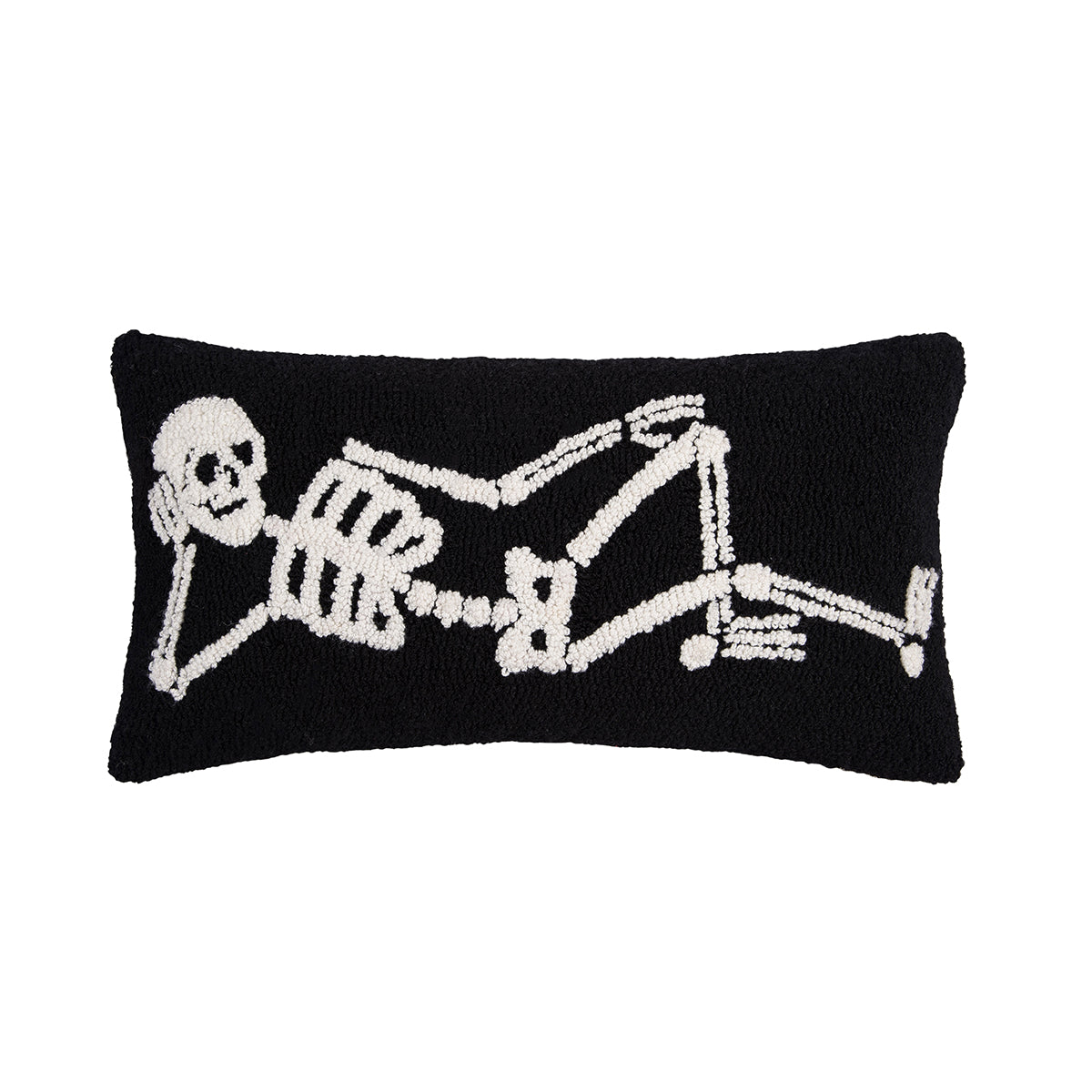 Bring a playful touch of Halloween humor to any decor with the Relaxed Skeleton Hooked Pillow. Featuring a black background, this pillow showcases a lounging skeleton casually propping its head on its hand, adding a laid-back vibe to the spooky season. The whimsical design offers a fun twist on a classic Halloween motif, making it perfect for adding a light-hearted, yet festive, element to any room. Whether used on a couch, bed, or favorite chair, this unique pillow is sure to be a conversation starter.