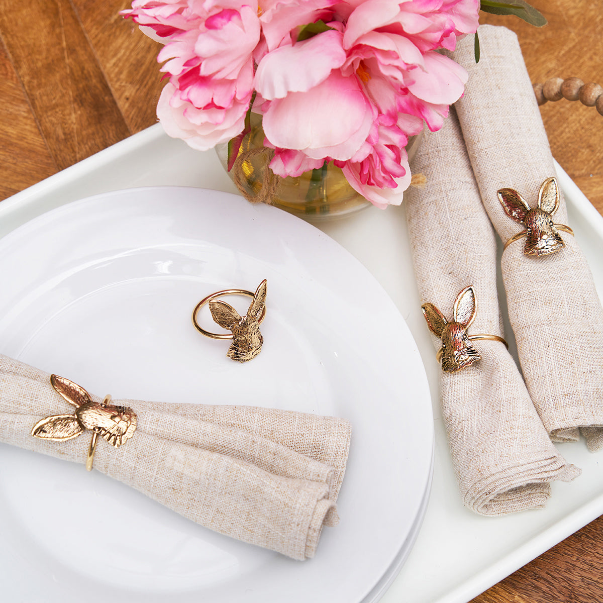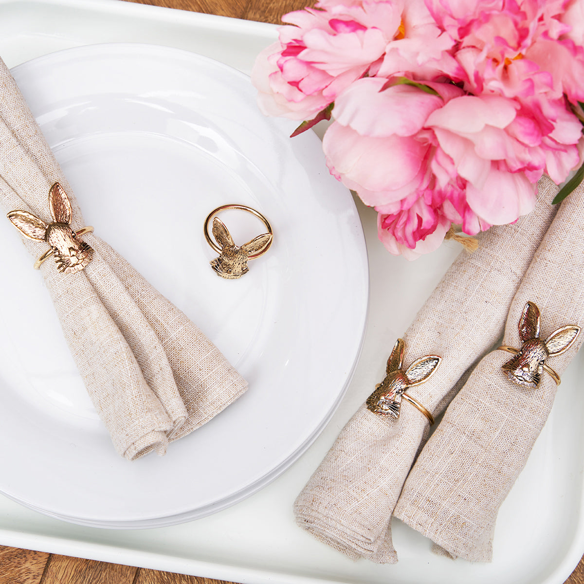 Elevate table decor with this napkin ring set, crafted from 100% zinc alloy and featuring a playful rabbit head charm. Ideal for Easter or spring occasions, the fun design will complement any tabletop aesthetic.