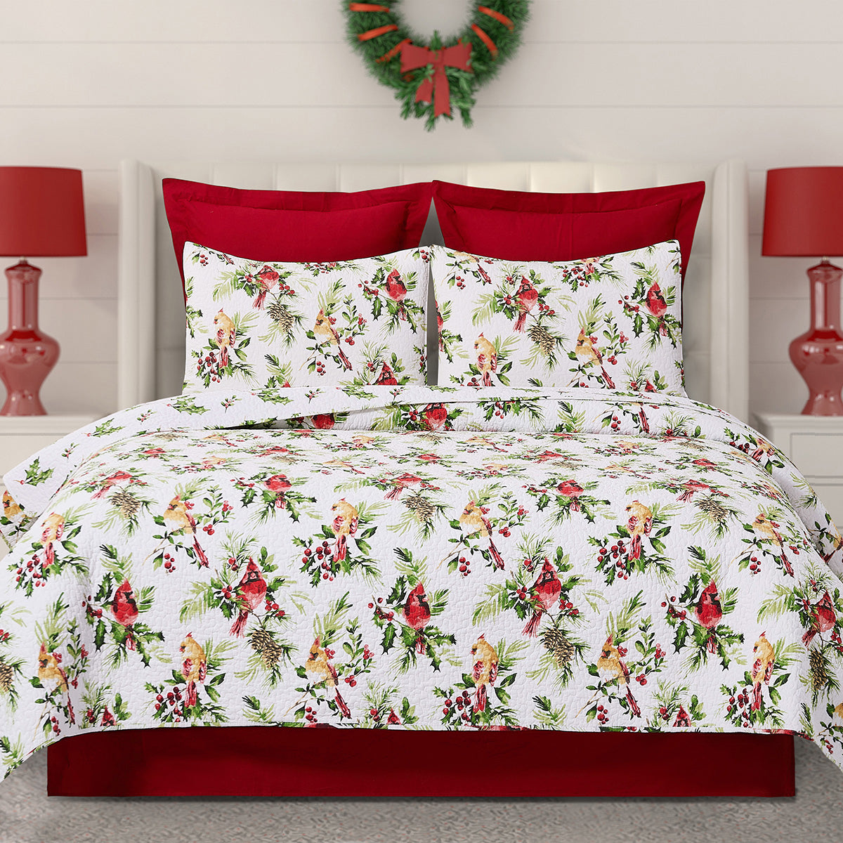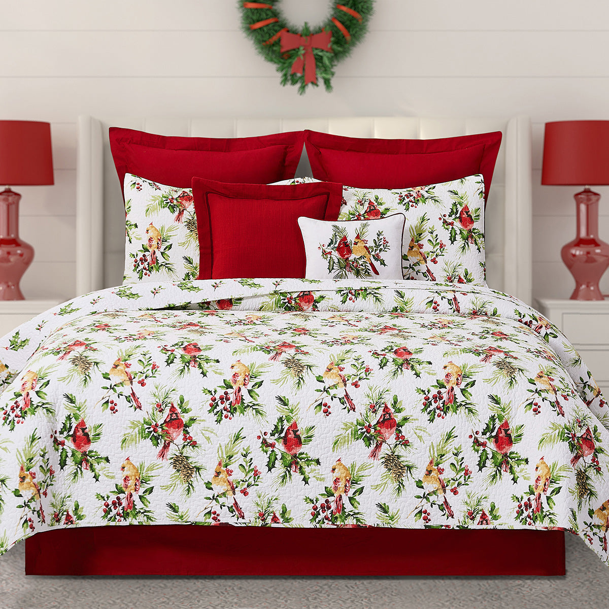 Experience the perfect holiday comfort with the Ruby Cardinal quilt set. Constructed with random stitching and a 100% cotton cover with poly-cotton blend filling, it is sure to keep you warm and cozy. Featuring a festive red and yellow cardinal pattern on holly leaves, and a reversible tossed holly berry pattern, you can enjoy the winter season in style. Love this pattern? Ruby Cardinal is also available in a tabletop collection.