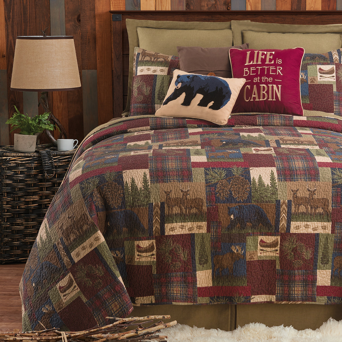 Create a cozy, rustic cabin atmosphere with the Rutherford Breeze Quilt Set. Featuring a charming patchwork scene of woodland creatures in warm, earthy tones. This set is sure to inspire a sense of comfort and tranquility in any bedroom. And with a solid brown reverse, you can easily switch up the look anytime.