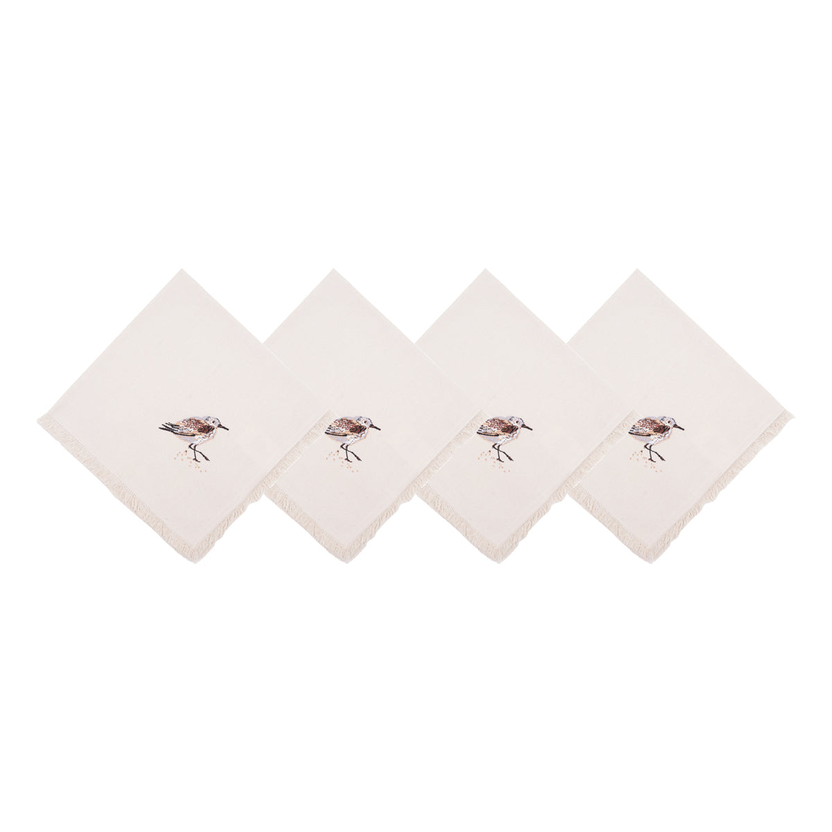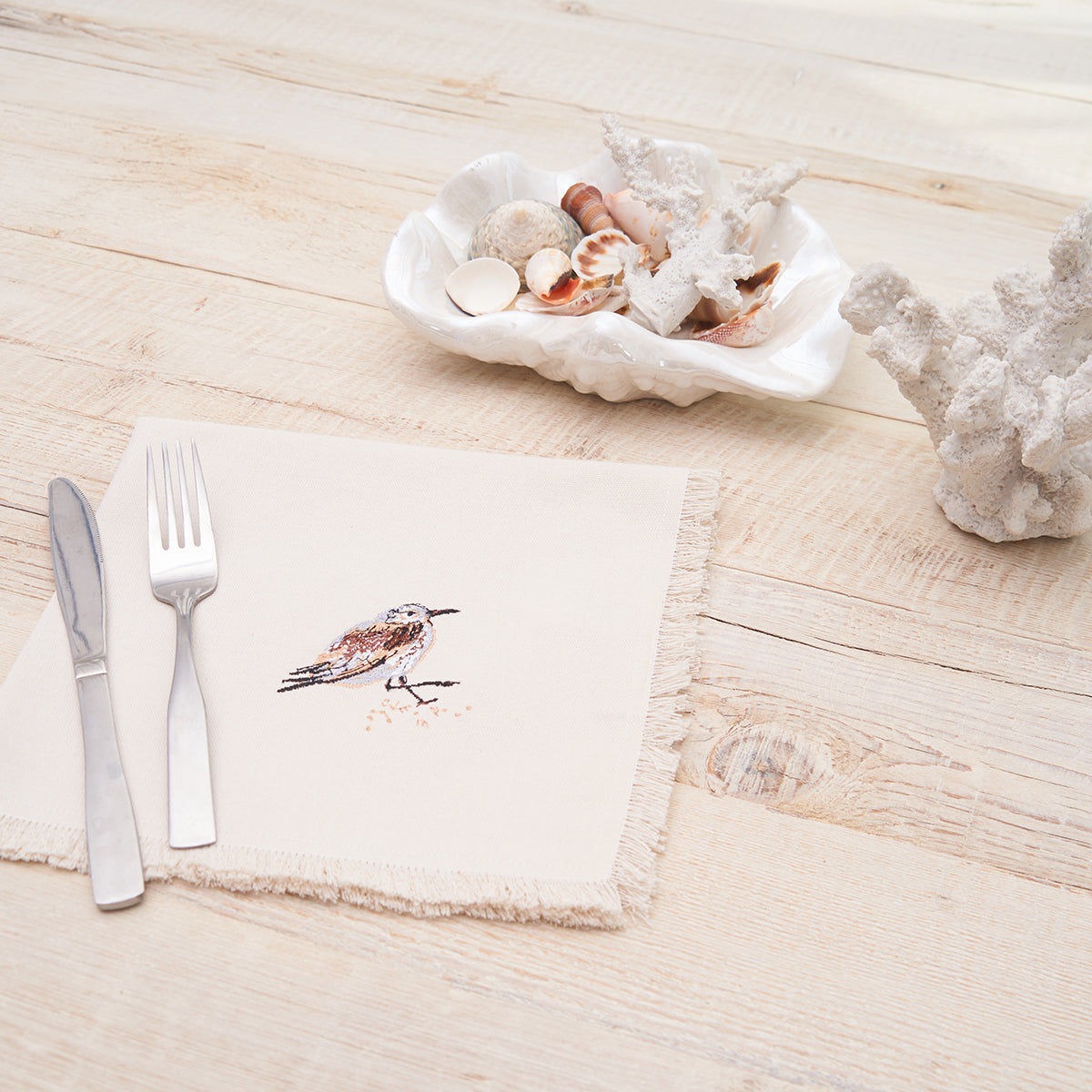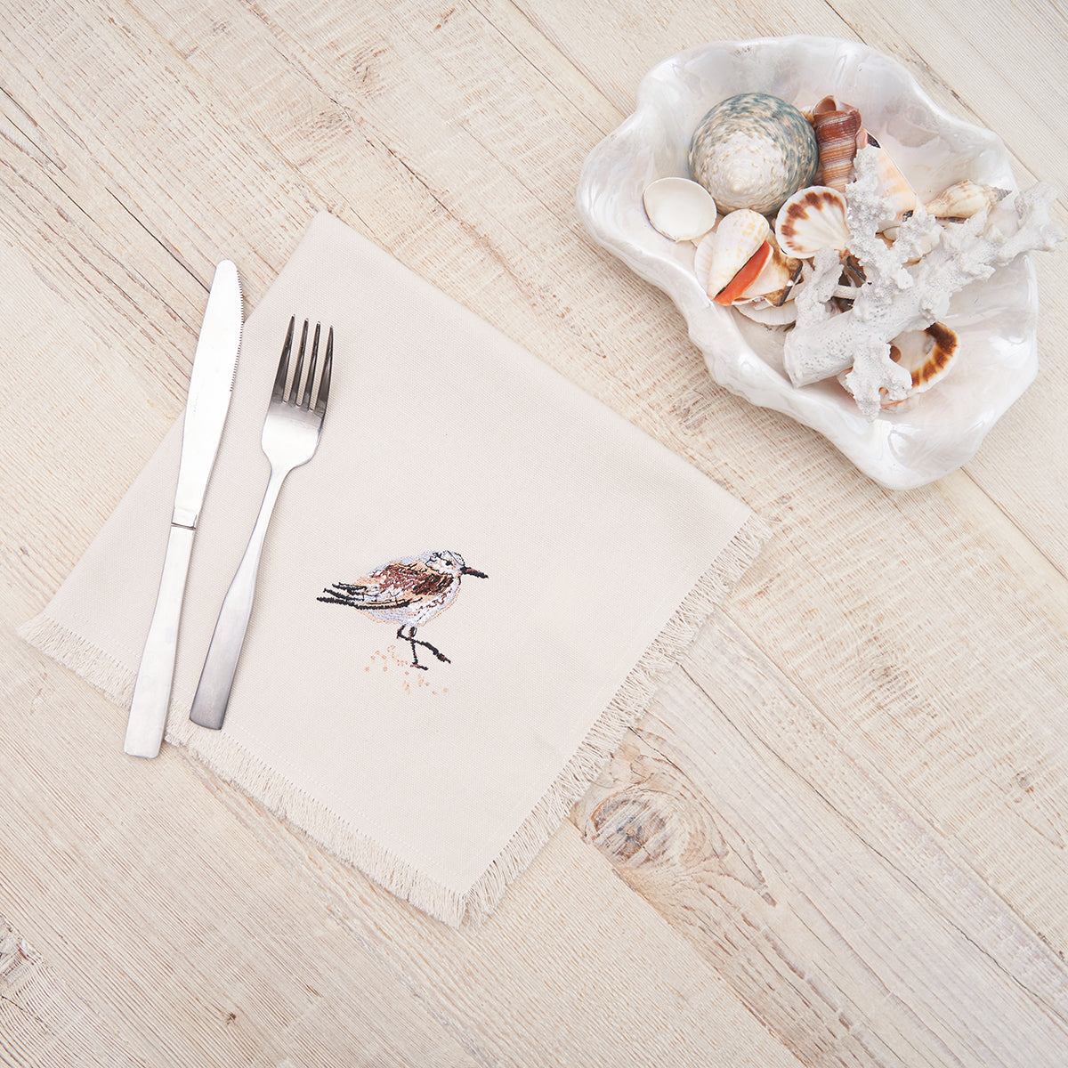 Don't get your feet wet! On our cotton table linens, sandpipers sprint along the waters edge looking for a snack. Featuring a fringed edge and beautiful embroidery, these placemats add a bit of playfulness to your coastal casual table.