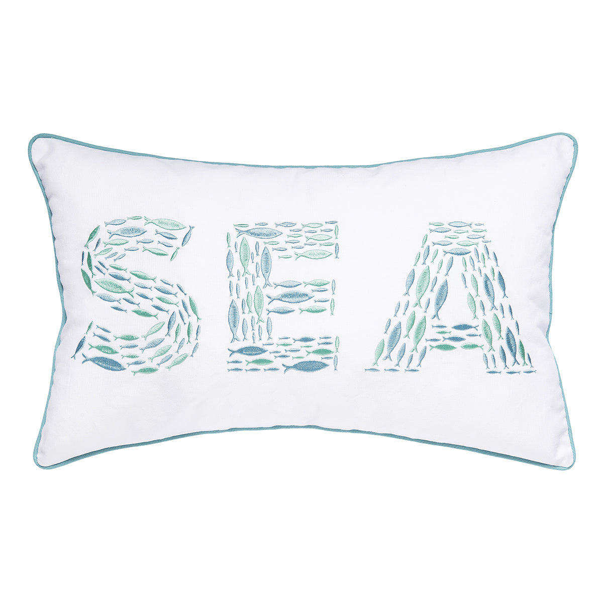Crafted from a series of little fish in coastal shades of blue and seafoam green, this embroidered pillow creates the word Sea for a simple yet charming way to adorn a living space.