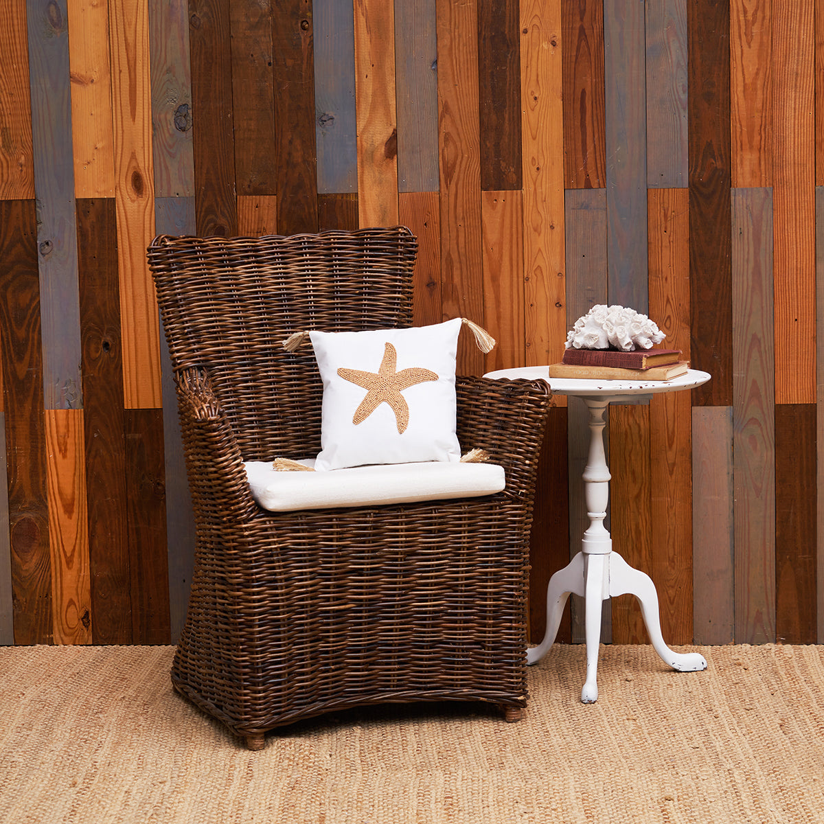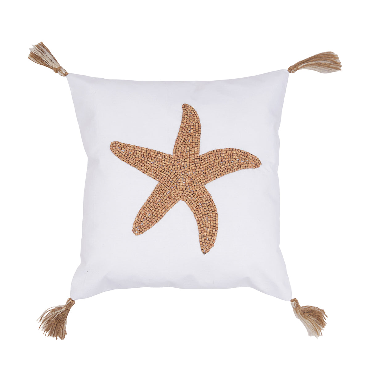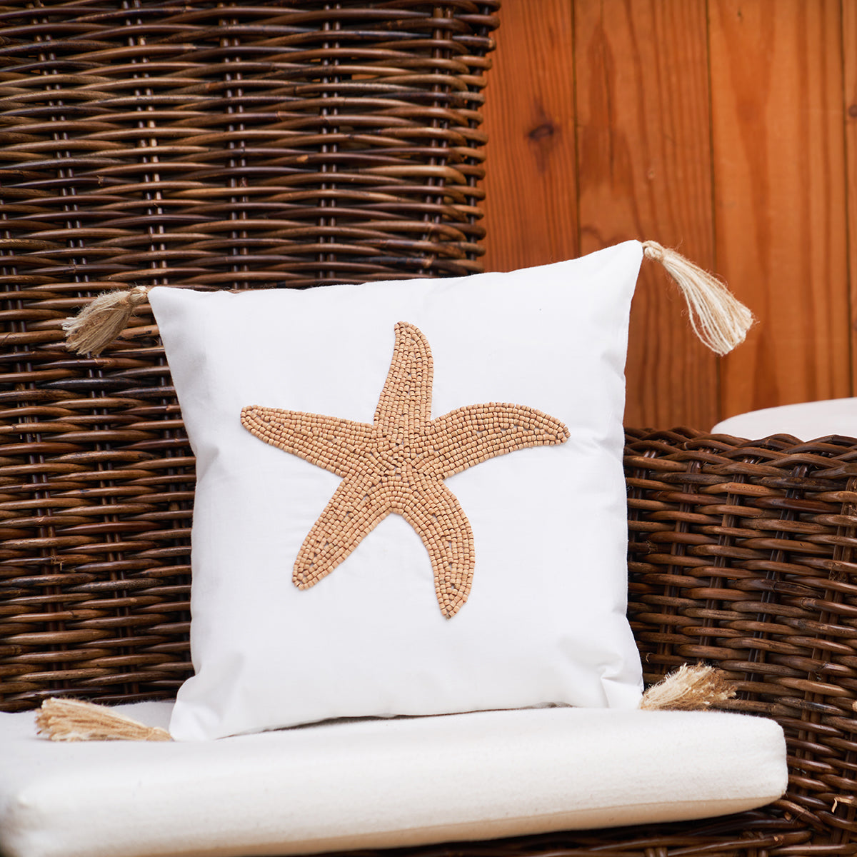 Featuring 100% cotton fabric on both the front and back, these coastal pillows elevate any space with their elegant charm. The centerpiece of each pillow is a coastal motif hand beaded with natural wood beads against a crisp white background. Finished with corner tassels, they're a stylish addition to home decor, infusing every room with coastal sophistication.