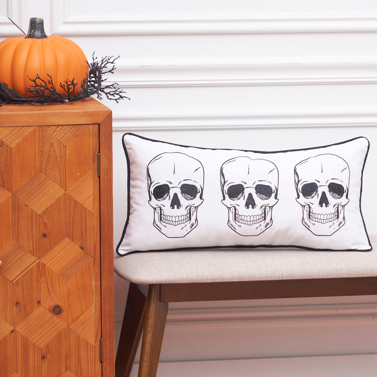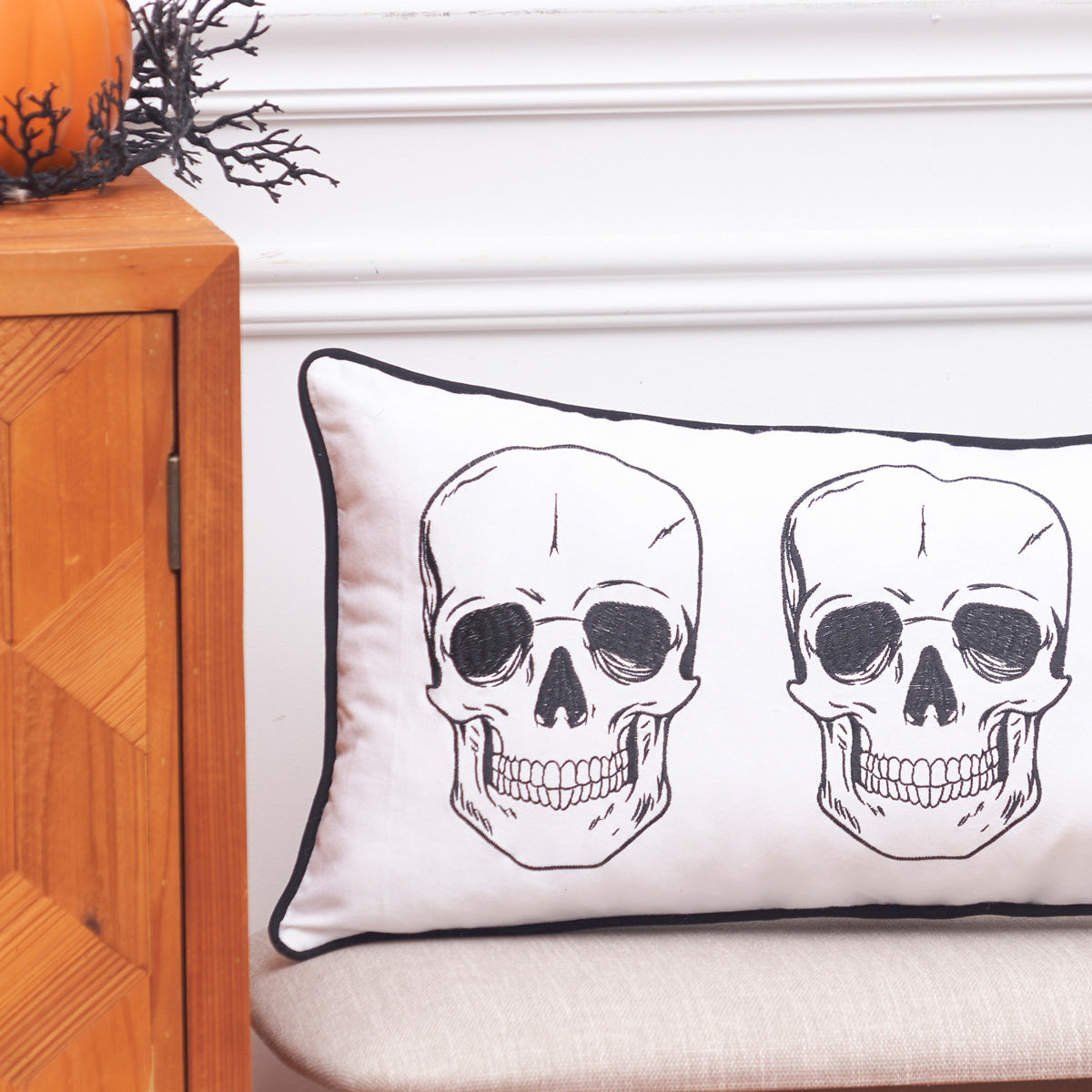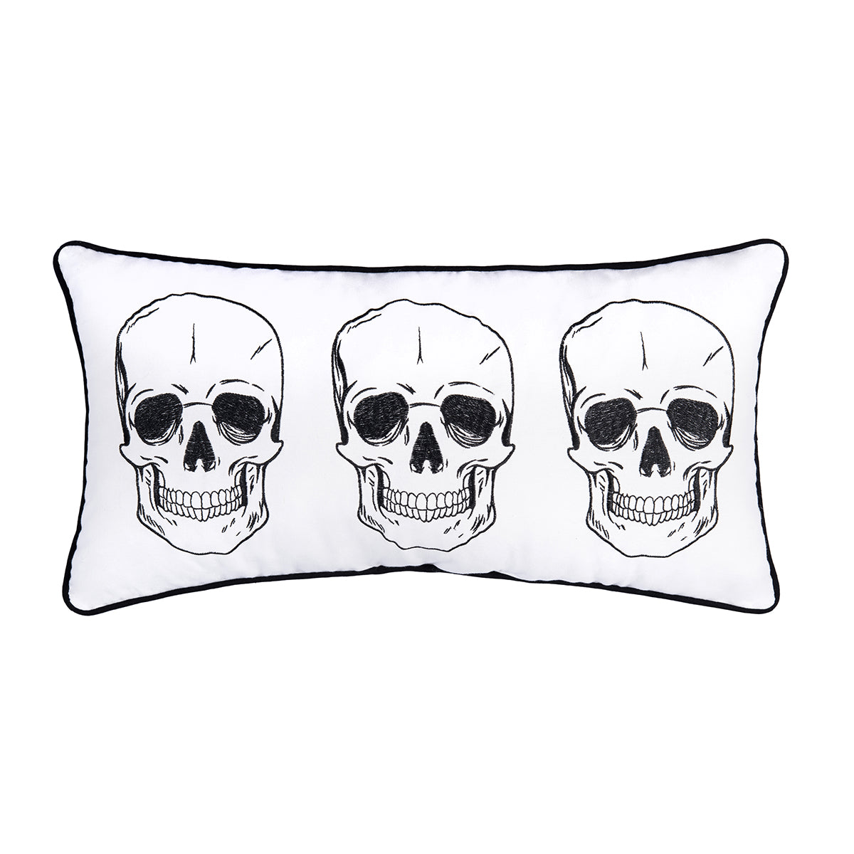 Add a touch of spooky elegance to Halloween decor with the Skully Pillow. This crisp white pillow features three intricately embroidered black skulls lined up across the front, creating a striking contrast against the crisp white backdrop. Trimmed in black, this pillow is perfect for Halloween or any time of year you want to add a little edge to a space. Bring both style and a hint of the macabre to any space with the Skully Pillow.