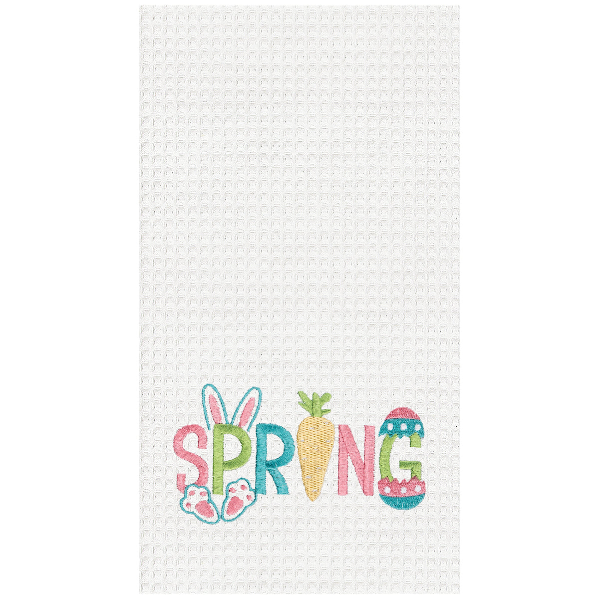 This whimsical embroidered waffle weave towel celebrates the joy of spring with the word "Spring" in pastel bright colors. The playful design features bunny ears and paws peeking out from between the "P," an open Easter egg surrounding the "G," and a cheerful carrot forming the "I." Perfect for adding a festive touch to your kitchen or bathroom, this towel brings a fun and vibrant atmosphere to your seasonal decor. With its soft texture and eye-catching design, it’s a charming addition that combines both style and functionality for the spring season.
