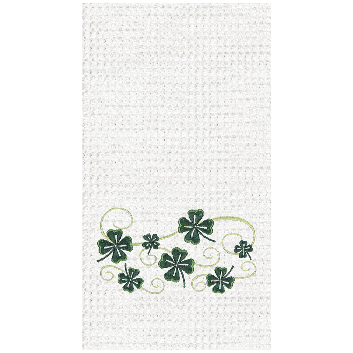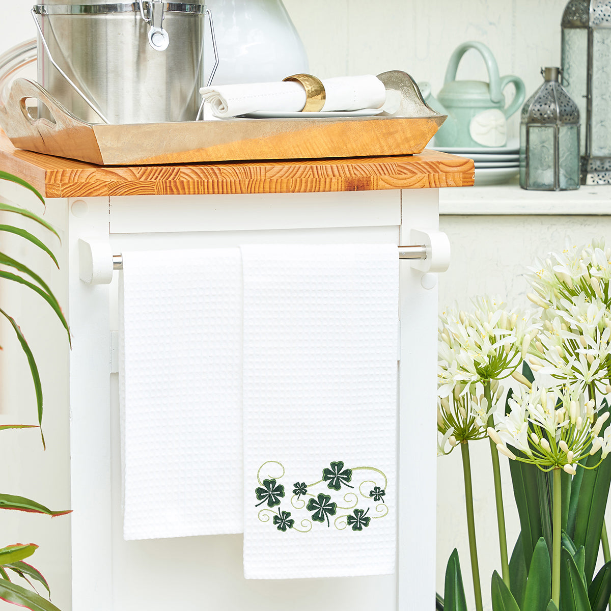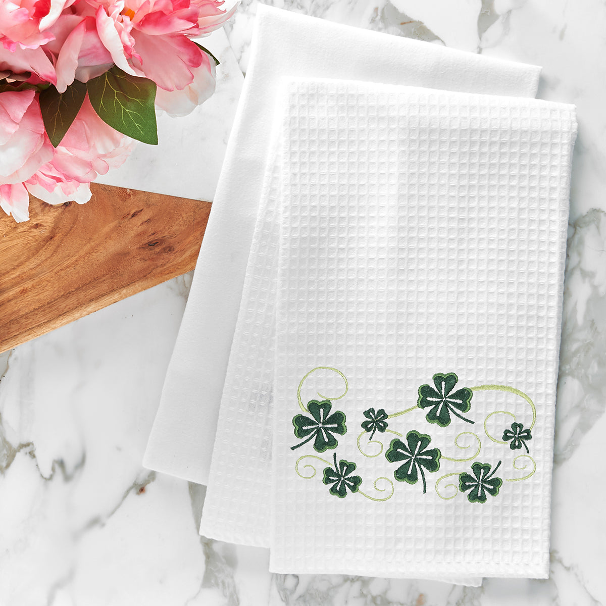 Enhance St. Patrick's Day celebrations with this sophisticated shamrock scroll embroidered on a waffle weave towel. The deep green shamrocks, intertwined with lighter green scroll flourishes, exude an elegant charm that elevates any setting.