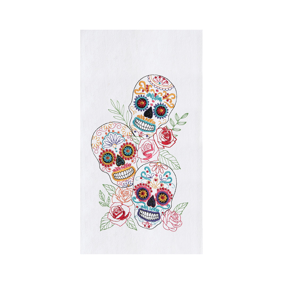 Go beyond your basic kitchen needs with this playful Stacked Sugar Skull Trio Flour Sack Kitchen Towel. Get ready to be wowed by its intricate details and vibrant colors, making sure to bring a smile to all who pass. Get creative and colorful in the kitchen with all the beauty of these three sugar skulls surrounded by roses.