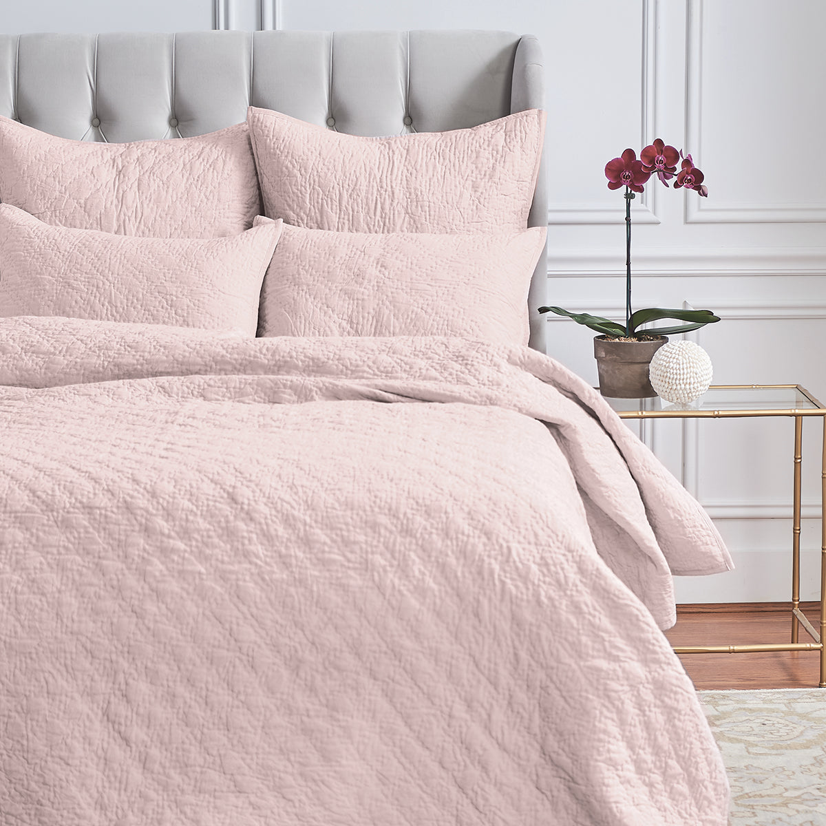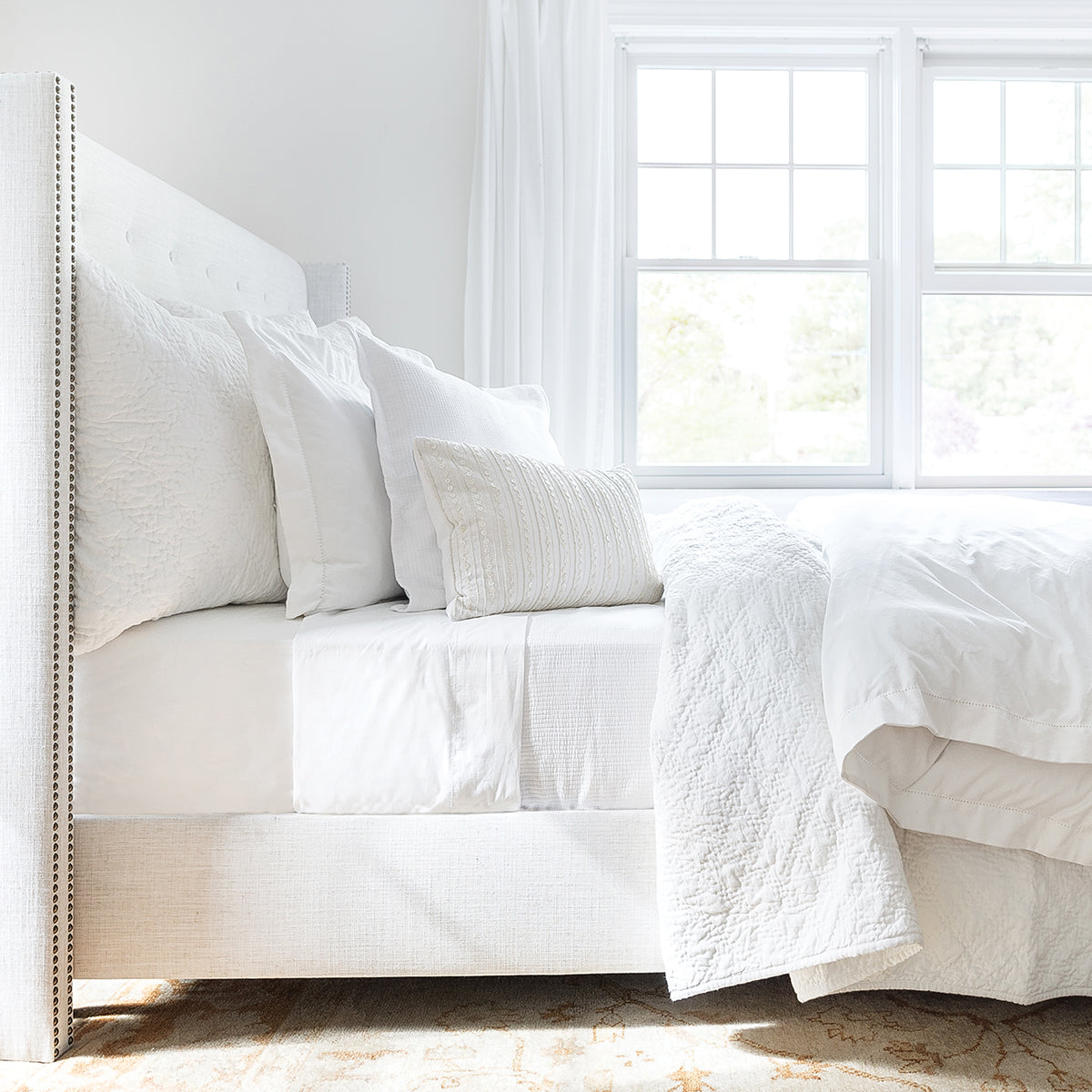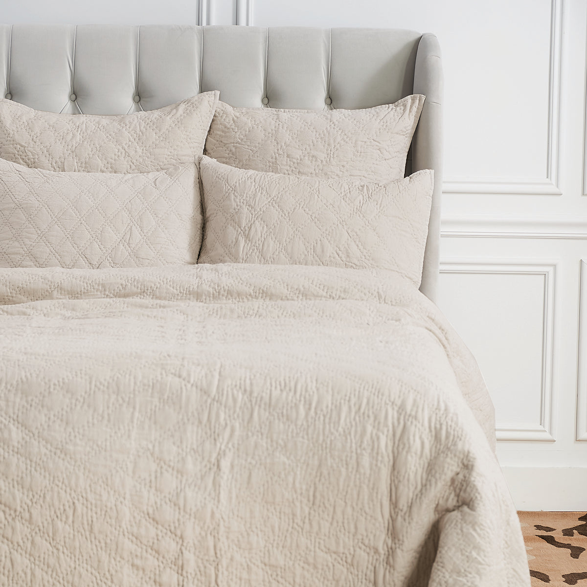 Draped in Diamonds. Double-layered diamond quilting is hand stitched across the 100% cotton chambray of the Sutton Quilt. These diamonds go with everything, and are begging to be layered and accented with simply elegant bedding and accessories. Create a glamorous look with the glint and gleam of metallic thread and glass beads, or build a classic look with solid throws and pillows.