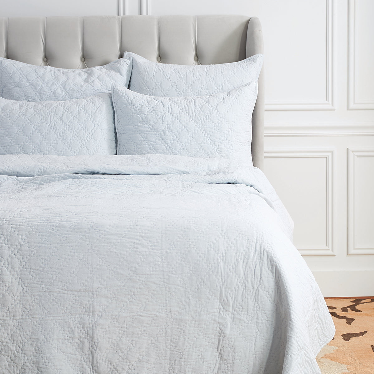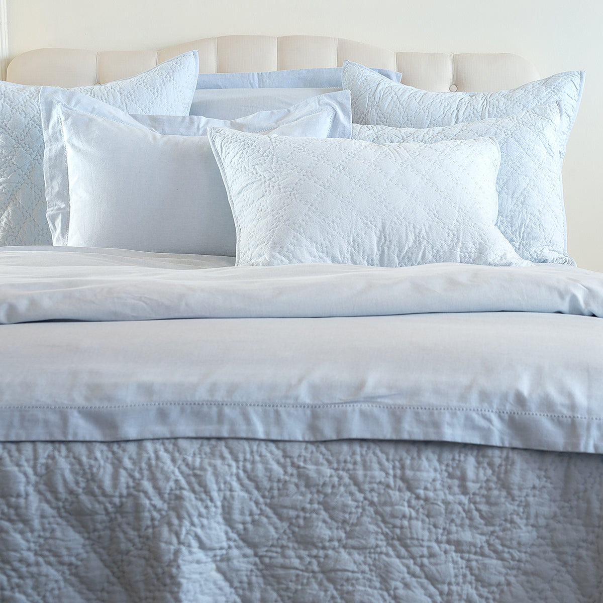 Draped in Diamonds. Double-layered diamond quilting is hand stitched across the 100% cotton chambray of the Sutton Quilt. These diamonds go with everything, and are begging to be layered and accented with simply elegant bedding and accessories. Create a glamorous look with the glint and gleam of metallic thread and glass beads, or build a classic look with solid throws and pillows.