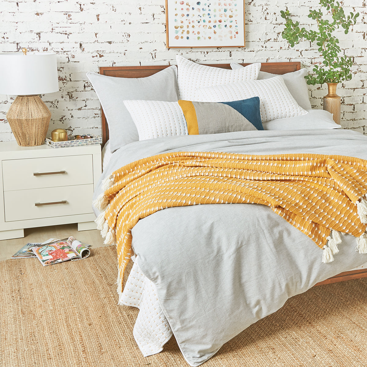 Tates cool grey appeal and the natural variations of 100% cotton chambray create the perfect combination of modern and casual, with a touch of individual personality. This standard sham creates endless opportunities for mixing and matching, framing each new style with its white piped border for a subtle tailored look.
