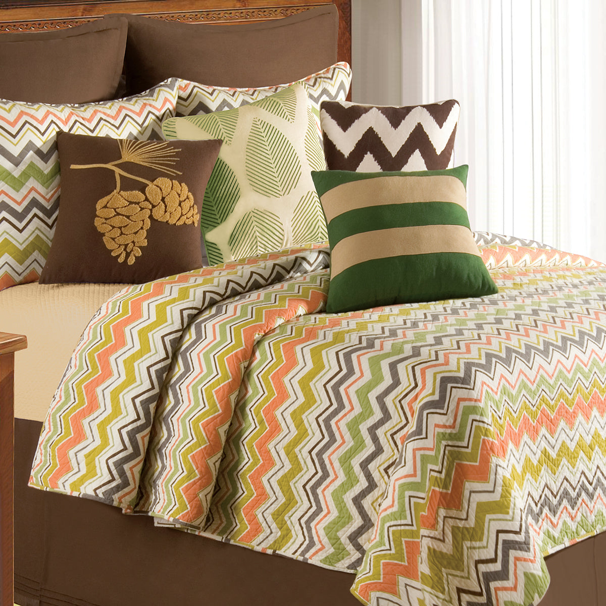 Lime and cantaloupe, mix with colors of nature in a zig-zag, chevron pattern on natural ground. Tazzo is a more muted colorway, but same pattern as Zara.