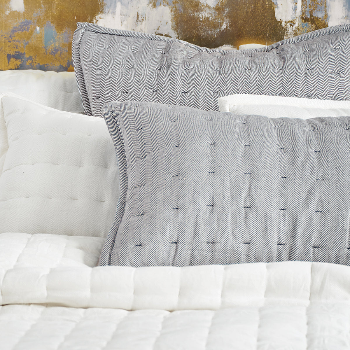 Tailored with texture and a subtle sheen, the Tinsley collection will transform your bed with a dynamic flair. The woven petite herringbone pattern and featured channel stitching provide a unique interplay of textures that simultaneously enthralls and invites. When paired with rich colors and bold accessories, the effect is irresistible.