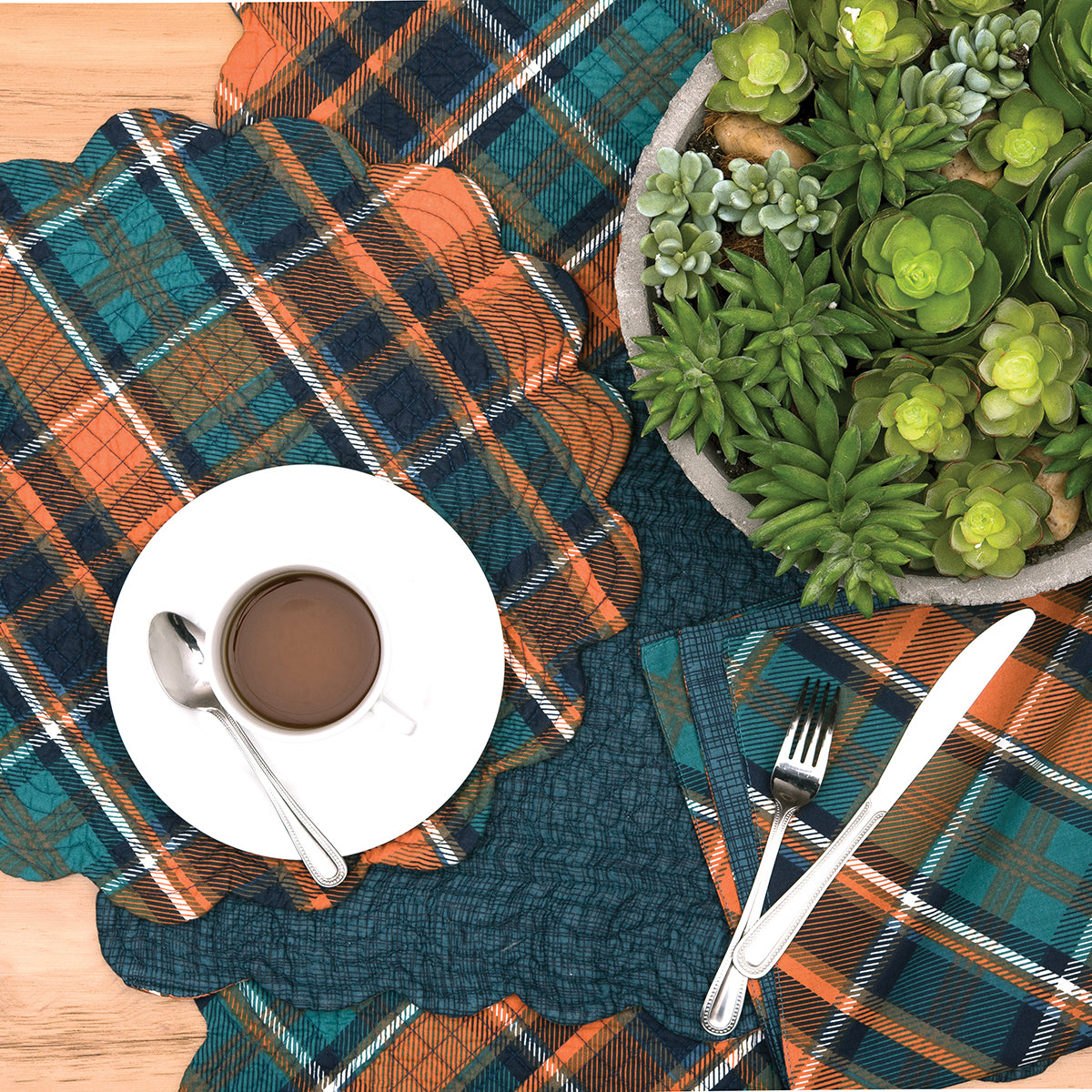 With a tabletop collection as versatile as Troy Plaid, the options are endless. With a plaid pattern comprised of intertwining navy, orange, white and teal, this design can be styled with your nautical, lodge, or contemporary decor. Reverse to a blue grid pattern for even more styling options. Coordinating placemat and table runner available separately.