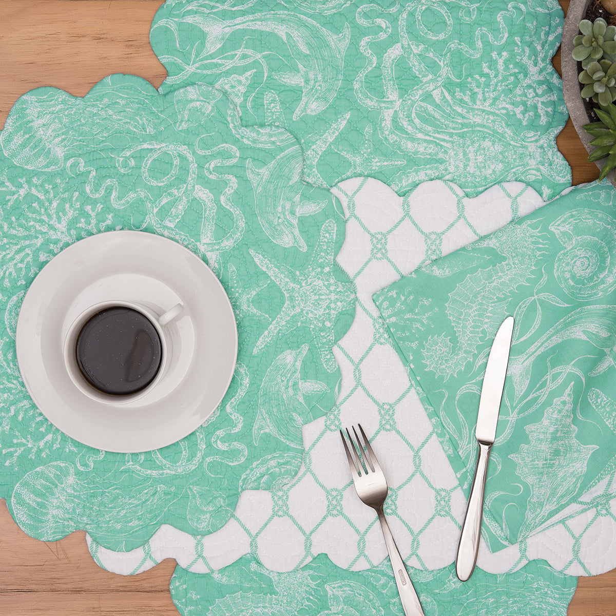 Bring the ocean to you - no matter where you are - with Turquoise Bay tabletop collection. Featuring a graceful marine pattern on vibrant seafoam green, the Turquoise Bay collection is perfect for a modern beach look, a sophisticated coastal dining room, or a relaxing vacation spot breakfast nook. Turquoise Bay reverses to a coordinating net and double Carrick bend knot design for even more coastal or nautical styling options. Finished with a turned seam for a fully reversible napkin, this tabletop collection is crafted of 100% cotton. Stains and spills are no problem, machine wash cold and tumble dry low for easy care. Love this pattern? The Turquoise Bay collection is also available in a bedding collection.
