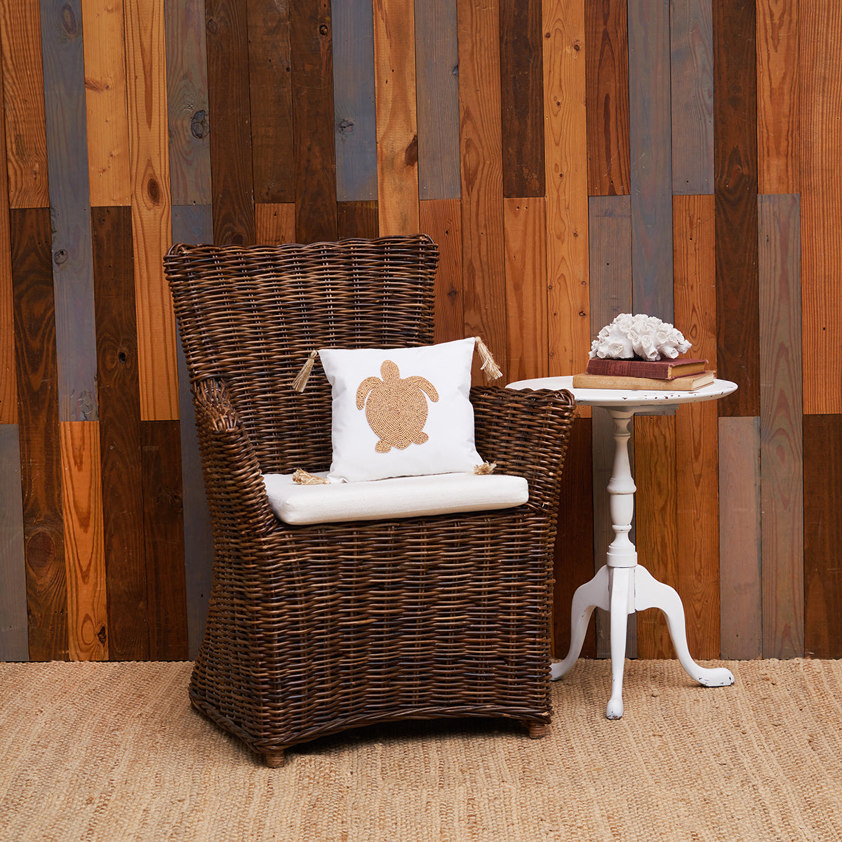 Featuring 100% cotton fabric on both the front and back, these coastal pillows elevate any space with their elegant charm. The centerpiece of each pillow is a coastal motif hand beaded with natural wood beads against a crisp white background. Finished with corner tassels, they're a stylish addition to home decor, infusing every room with coastal sophistication.