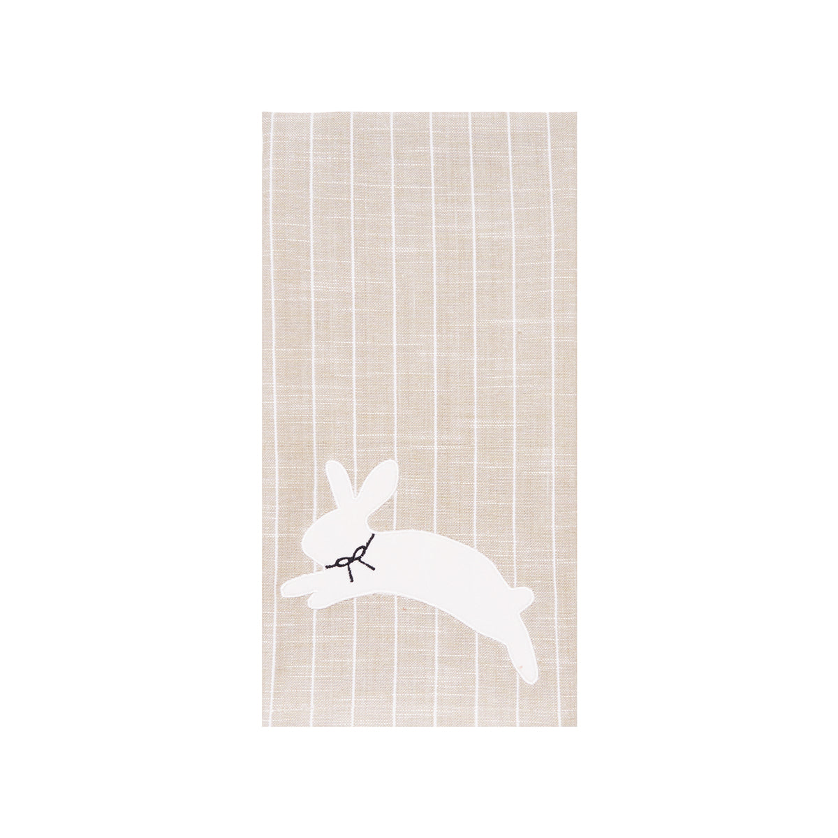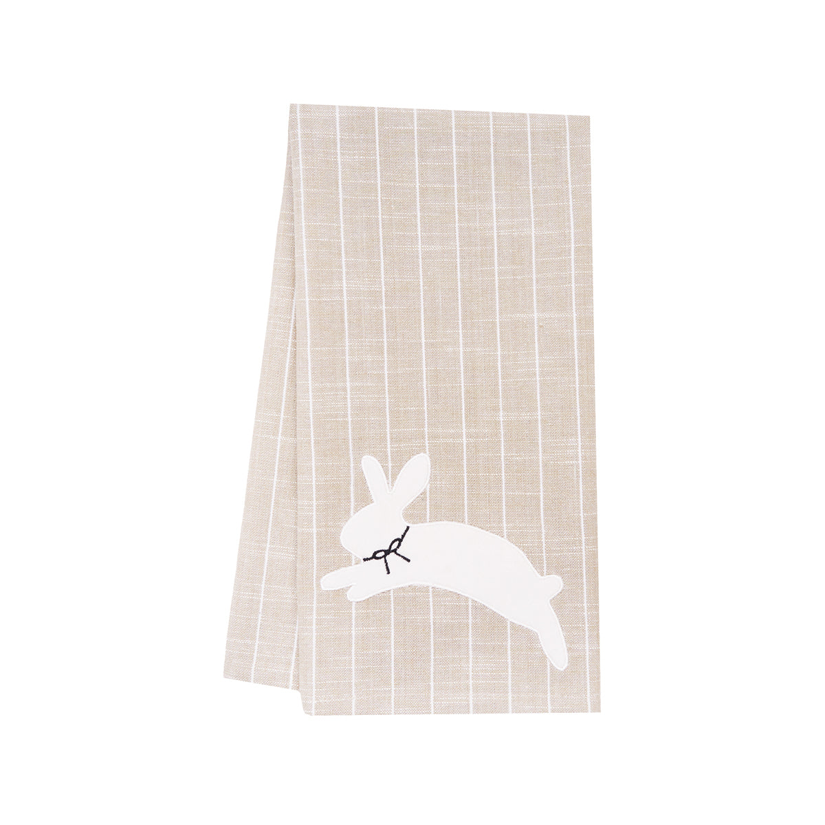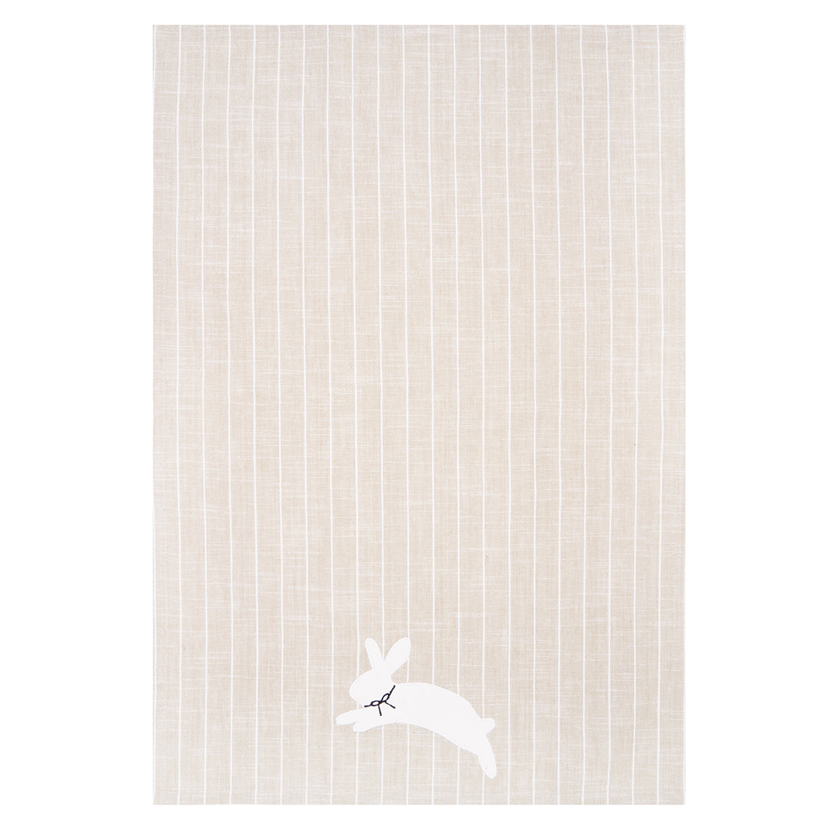 Featuring a neutral background with delicate white stripes, this embellished kitchen towel is adorned with a charming white leaping rabbit, complete with a delicate bow around its neck.