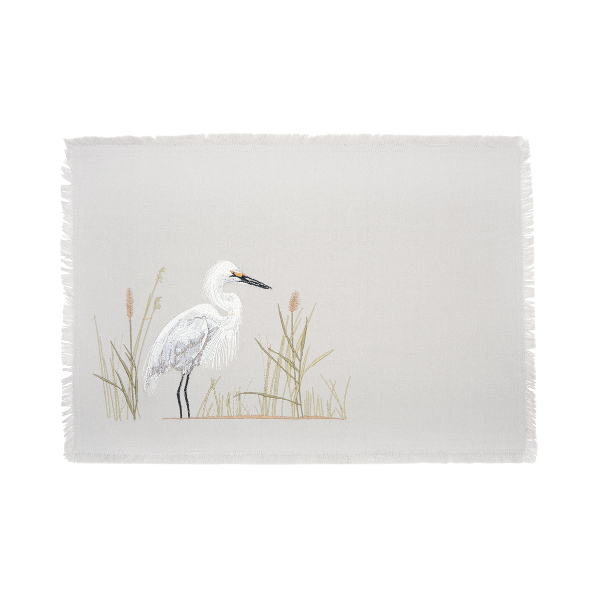 Standing majestically amidst its natural habitat of sea grasses, the white egret is showcased on a neutral background. These elegant coastal table linens bring a touch of beauty to everyday table settings.