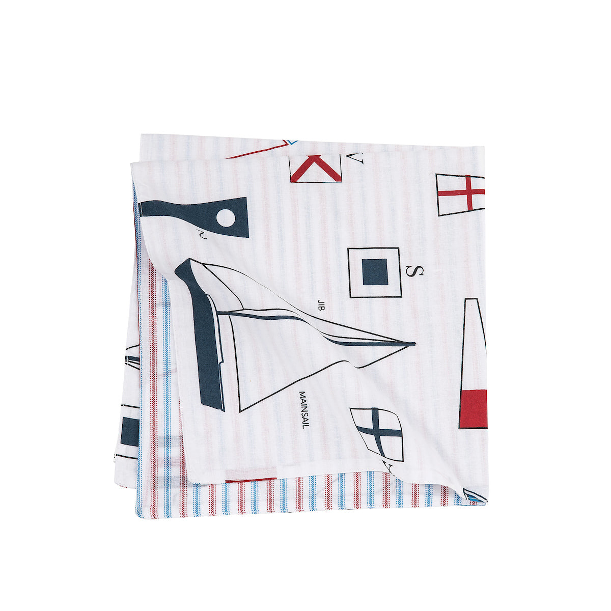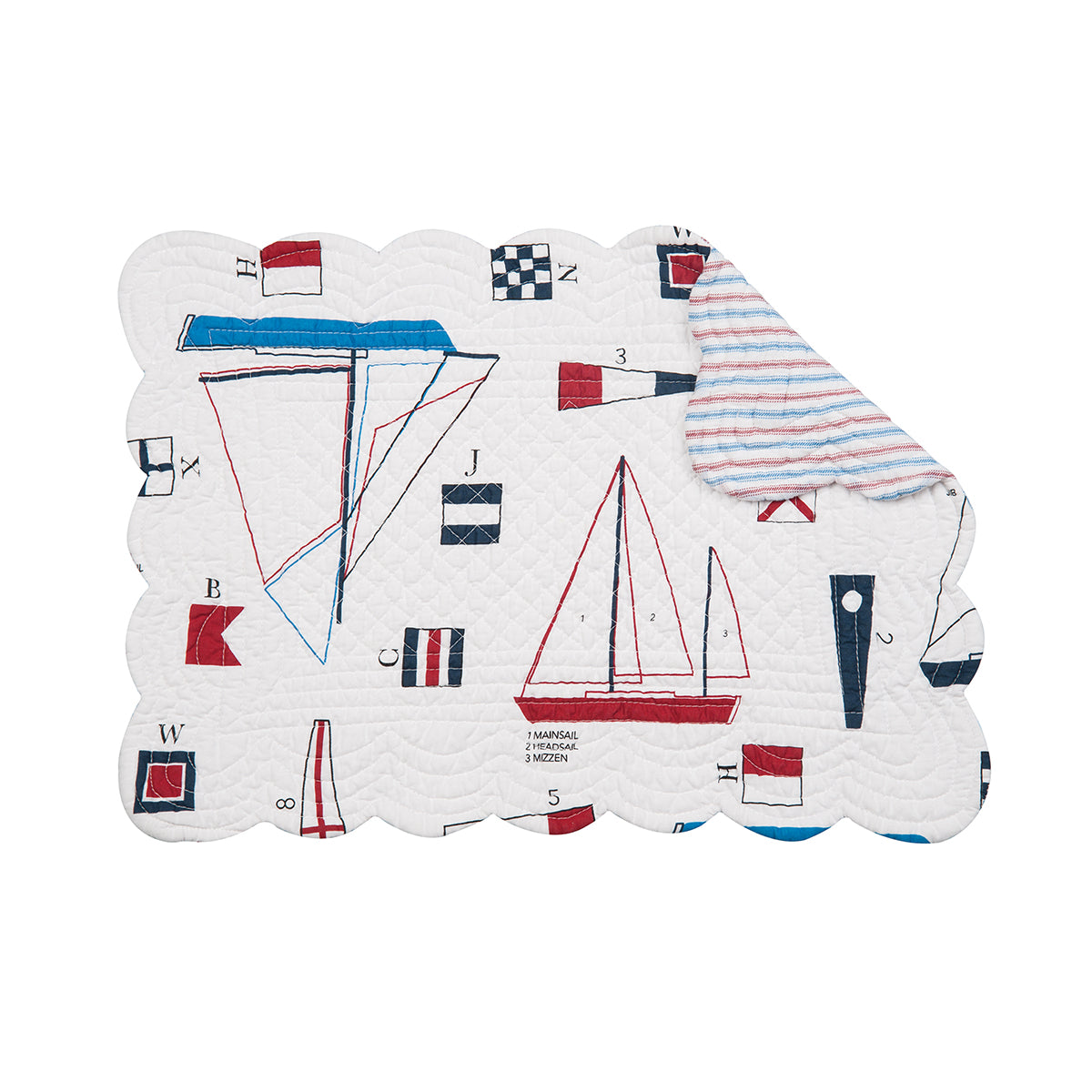 Both the red, white, and blue sailboat motif and the patriotic stripe pattern on the reverse of these rectangular Windward Port placemats will coordinate easily with your nautical theme or your everyday Americana style. These quilted cotton placemats will even put the wind in your sails for a dockside Fourth of July barbeque!