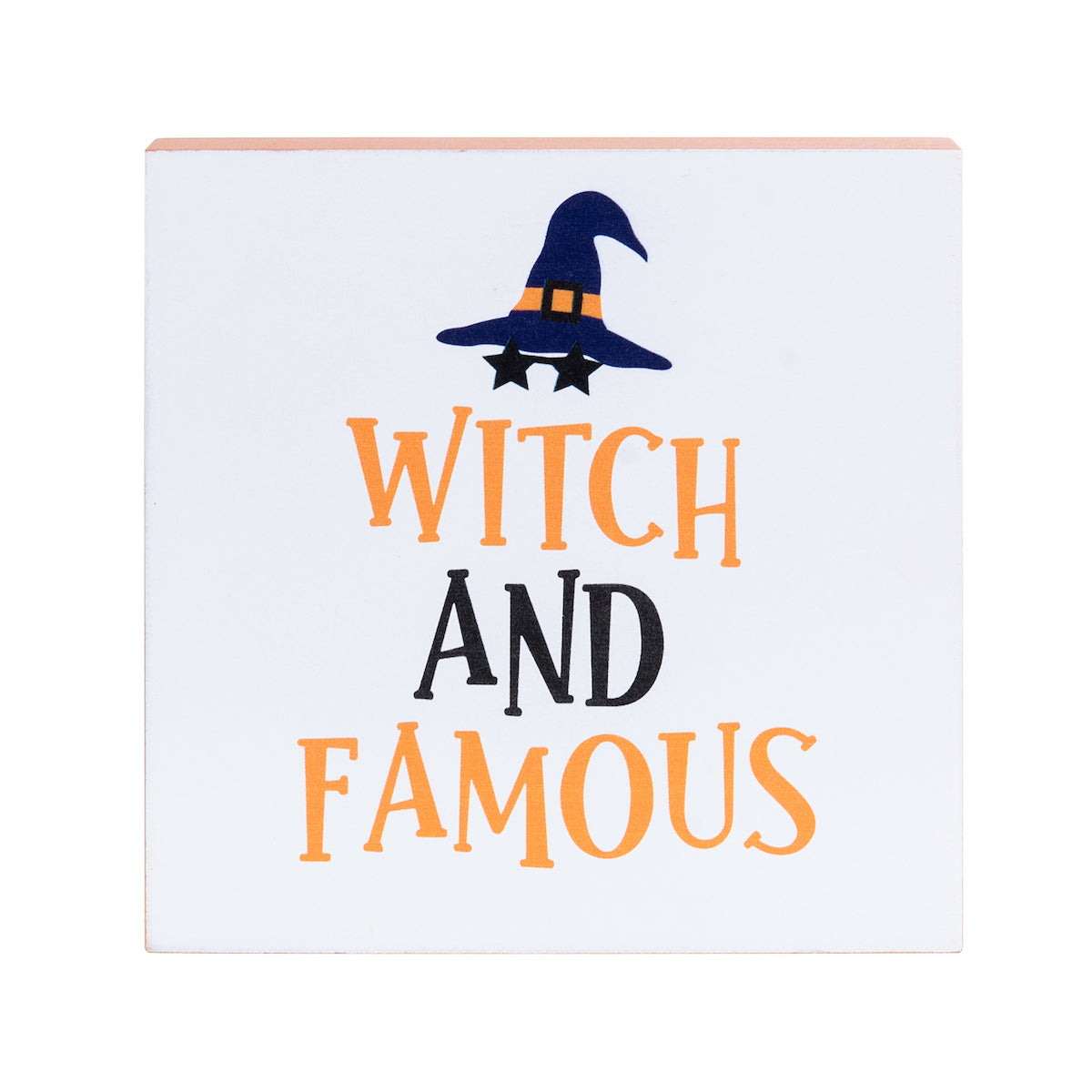 This festive Halloween shelf block features Witch and Famous written in black and orange on a white background with a witch hat on top.